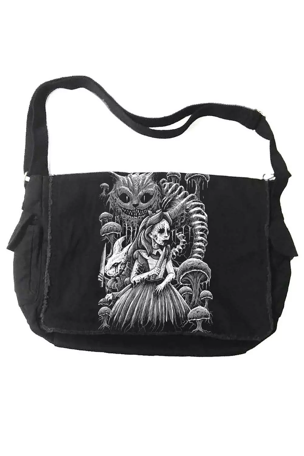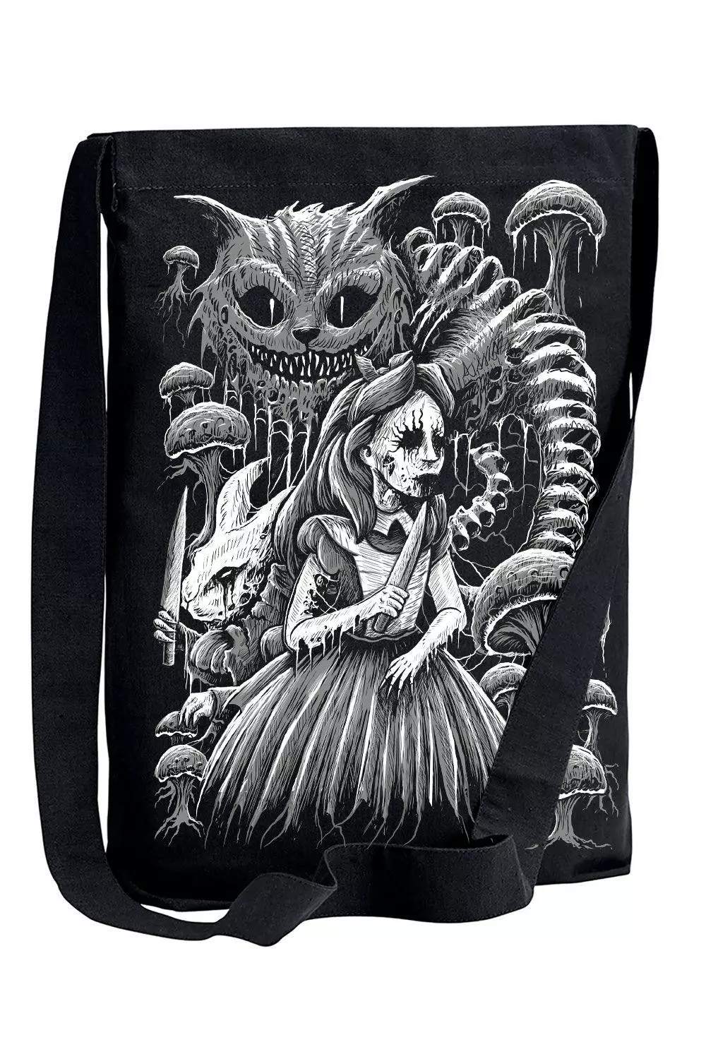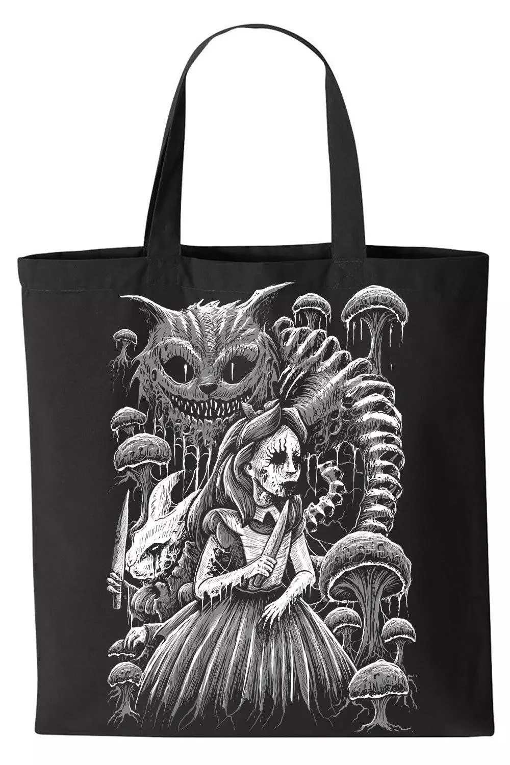 Tote your wicked, weird essentials in this sickening bag! Murder your way into Wonderland in the distressed design, featuring Alice and the White Rabbit haunting Wonderland with knives in hand. The Cheshire Cat lurks above them—his striped tail composed of spinal bones. Handprinted and hexed in the USA to please your dark heart.