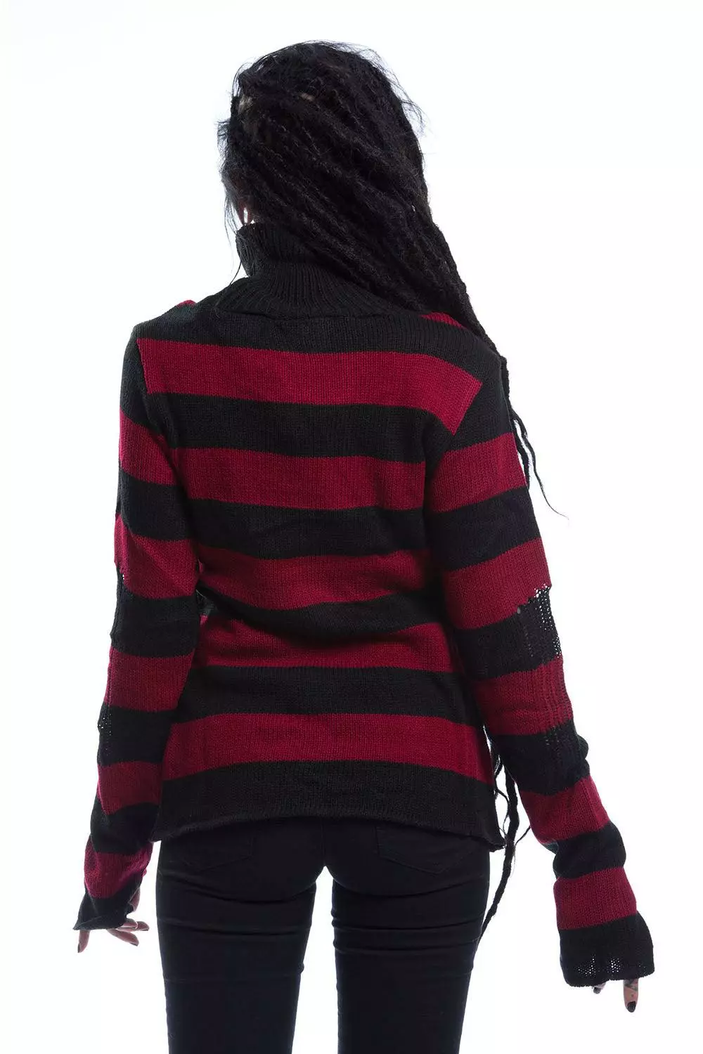 Waken the night in this stunning striped long sleeve! Soft and spooky, this black and red sweater is shredded with distressed details, striped knit design, and oversized neckline. Features thumbholes to keep your hands cozy when you text + hex.