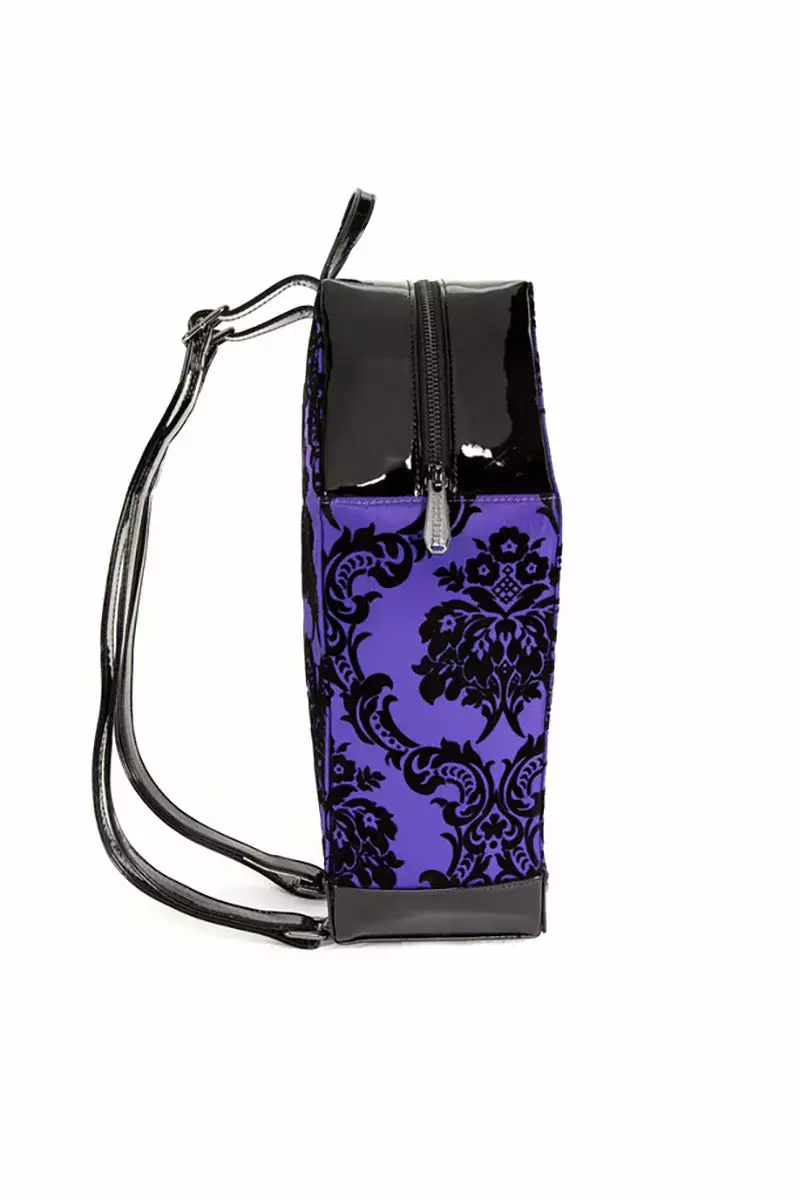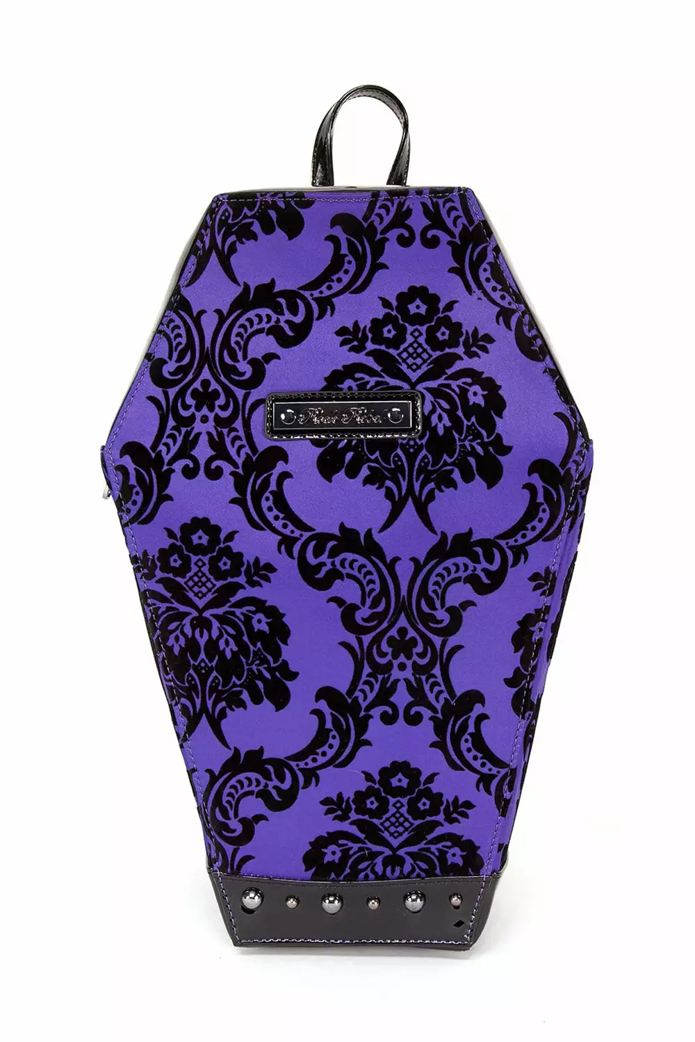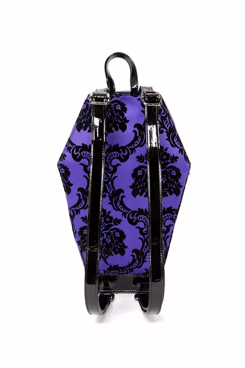 Carry your essentials in spooky style! This gravely gorgeous backpack features a 3D coffin construct, romanced with a beautiful velvet damask pattern. With a main zipper close and inner pocket, this purple backpack’s got plenty of room for toting your wallet, phone, makeup, and other earthly wares. Finished with vinyl leather accents and metal circle studs to make this coffin backpack a deadly delight! Complete with adjustable shoulder straps for when you needs your hands for praying to the dead.