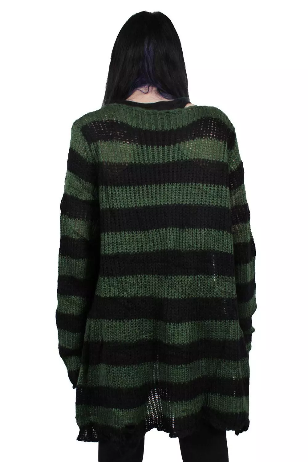 Roam netherworlds in this statement striped sweater! Sinfully soft and stretchy, this gravely goth sweater is hexed all-over with dark green and black stripes. Haunt the woodlands in the distressed details, finished with an oversized fit to keep you comfy & creepy when you wander the shadowlands.