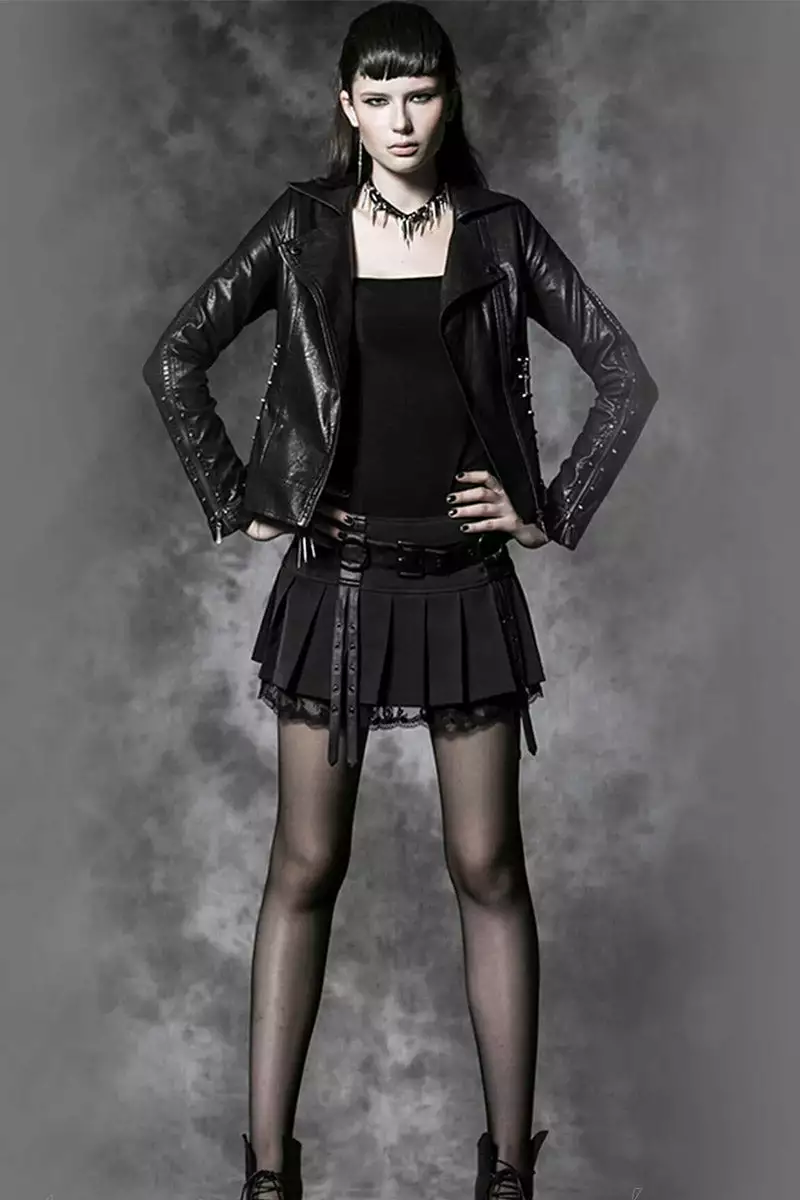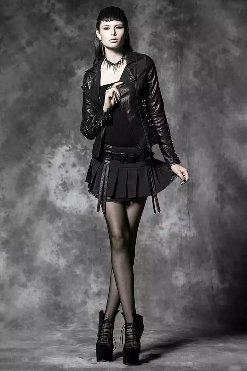 Get up to no good in this hella hot mini skirt, made for darklings in love with the shadows! Enchant the night in the a-line shape, pleated construct, and decorative mesh lace underlay. Buckle up in the adjustable vegan leather belt, complete with black metal o-rings and accent straps. Sinfully short and sexy to please the dark lord.