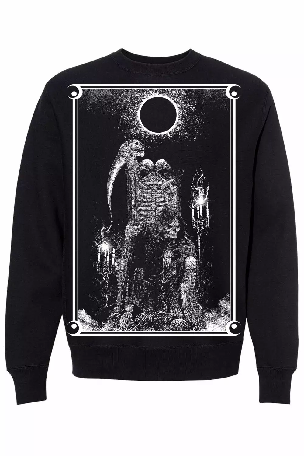 Pay homage to the harbinger of death in this gravely gothic sweatshirt! The Grim Reaper sits on a throne of human bone, ruling over his domain of the damned. Candles flicker on the Reaper’s scythe, made from the remains of his enemies. A black moon rises above in the forever-night sky… for in the underworld, darkness reigns.