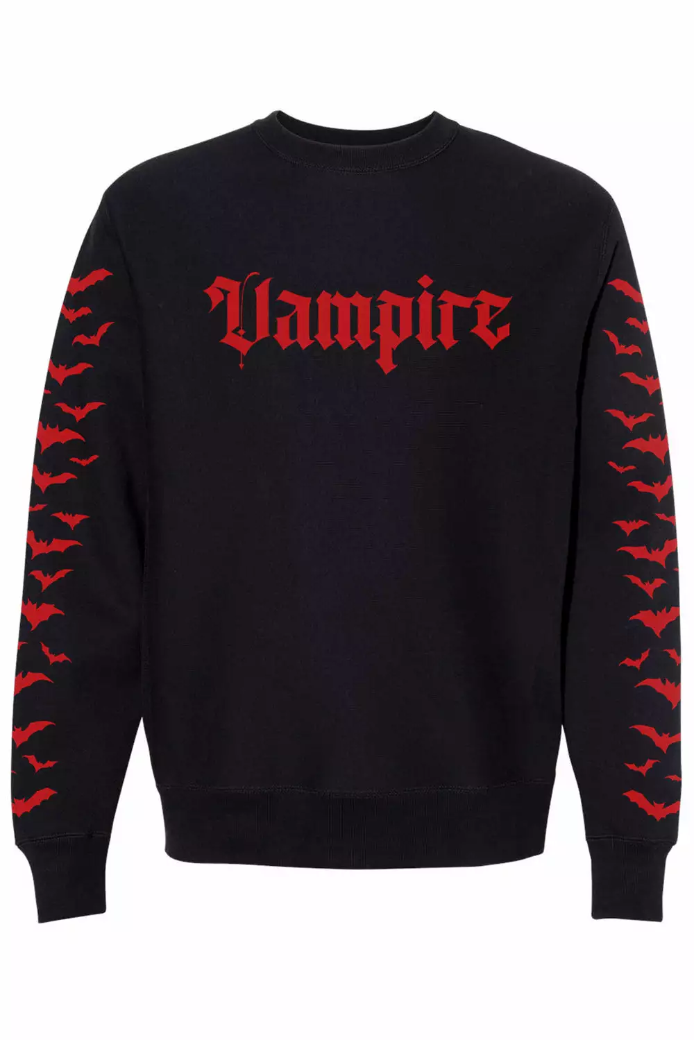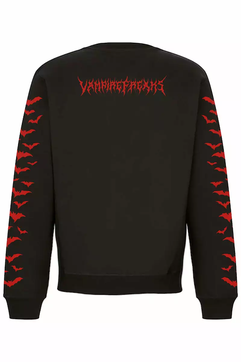 Make your bloodthirst known wearing this statement sweatshirt, hand-printed and hexed for creatures of the night. Vampire is printed on sinfully cozy cotton in blood-red, gothic font. A cauldron of bats flutters up the sleeves to please your cold, dead heart. Finished with VampireFreaks branding on the back to make mortals beware.