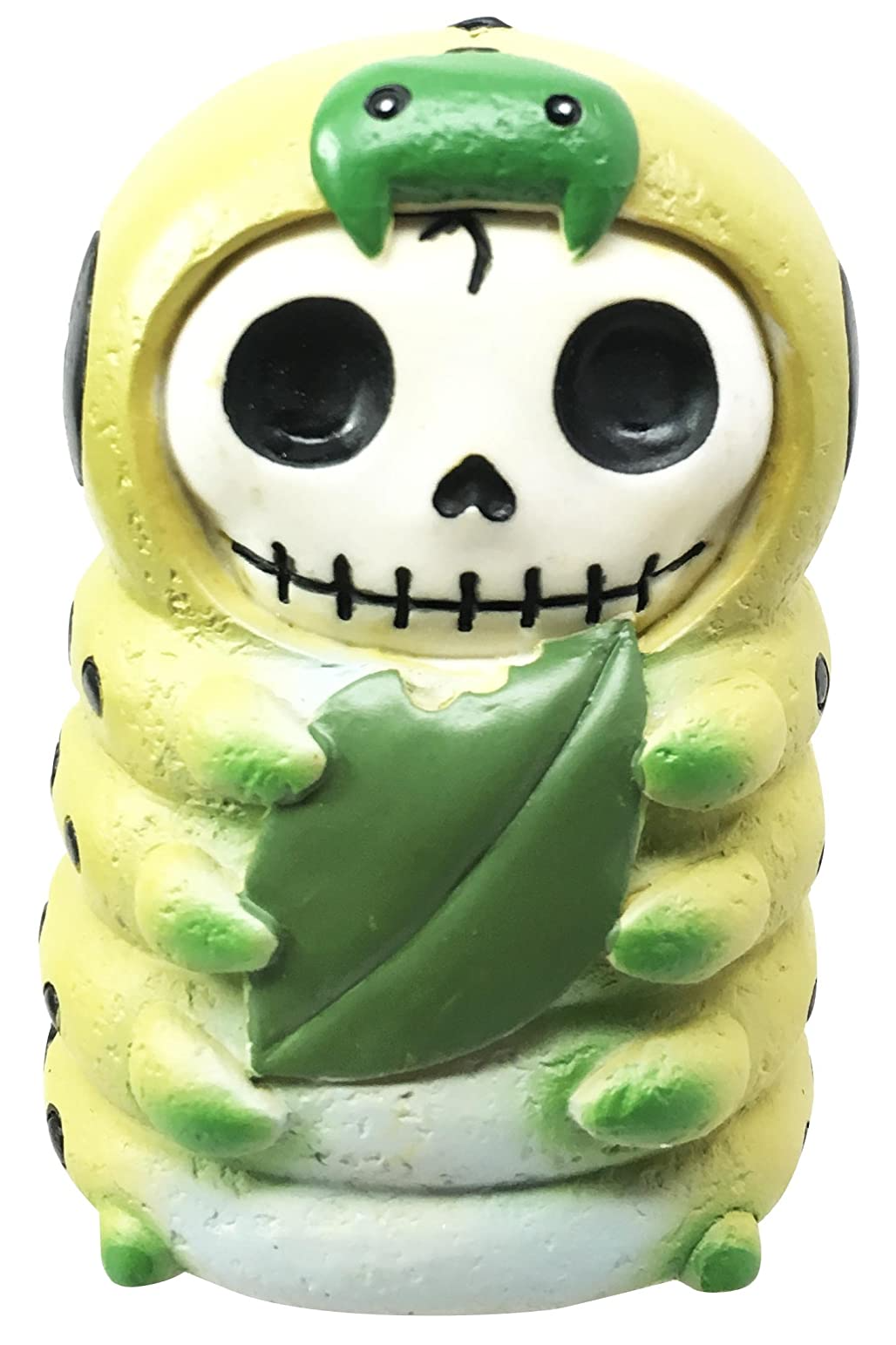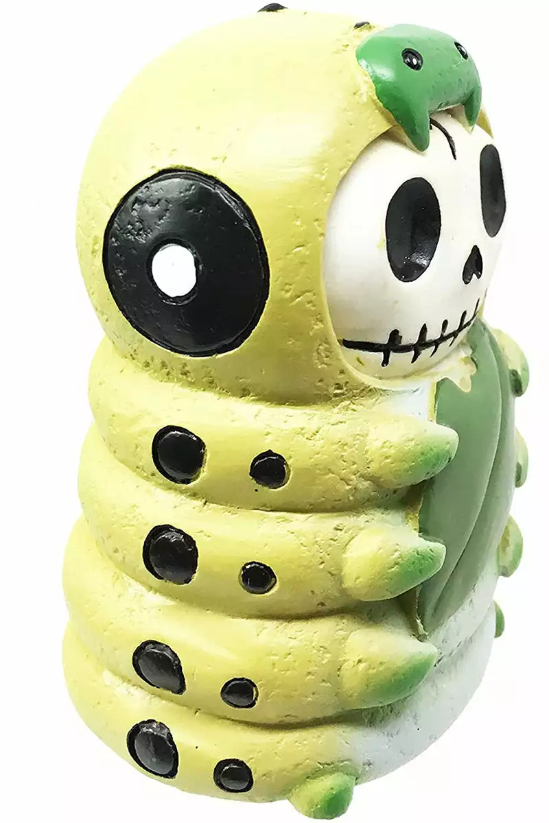 Transform your room into a creepy crypt with Inch the Caterpillar! This spooky statue features a skeleton dressed his best in a little green bug suit. With big black eyes, stitched smile, and trusty leaf in hand, Inch is dying to haunt any desk, shelf, or table he can call home!