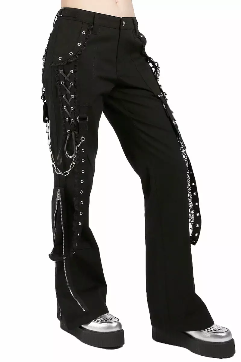 Catch glances and break hearts in these flared AF Tripp pants, designed to summon sweet spooks to your style. Corset details with black ribbon lacing possess the sides of these gothic lolita pants—ruffle accents and leg zippers haunt the flared fit. Finished with bondage straps, as baddie and beautiful as you.