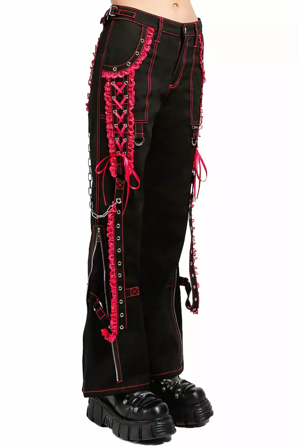 Catch glances and break hearts in these flared AF Tripp pants, designed to summon sexy spooks to your style. Corset details with hella hot pink ribbon lacing possess the sides of these gothic lolita pants—ruffle accents and contrast stitching haunt the flared fit. Finished with bondage straps, as baddie and beautiful as you.