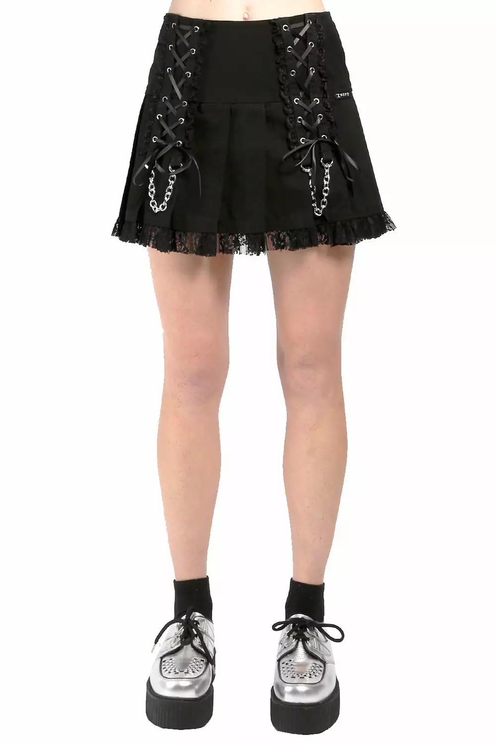 Conjure gothic romance to your alt style in this pretty pleated skirt, sexy and sweet as you! Made of 100% quality cotton, this gothic schoolgirl skirt features corset details and black ribbon lacing down the front. Catch glances and break hearts in the ruffle hem and frill accents. Finished with a discrete back zip closure.