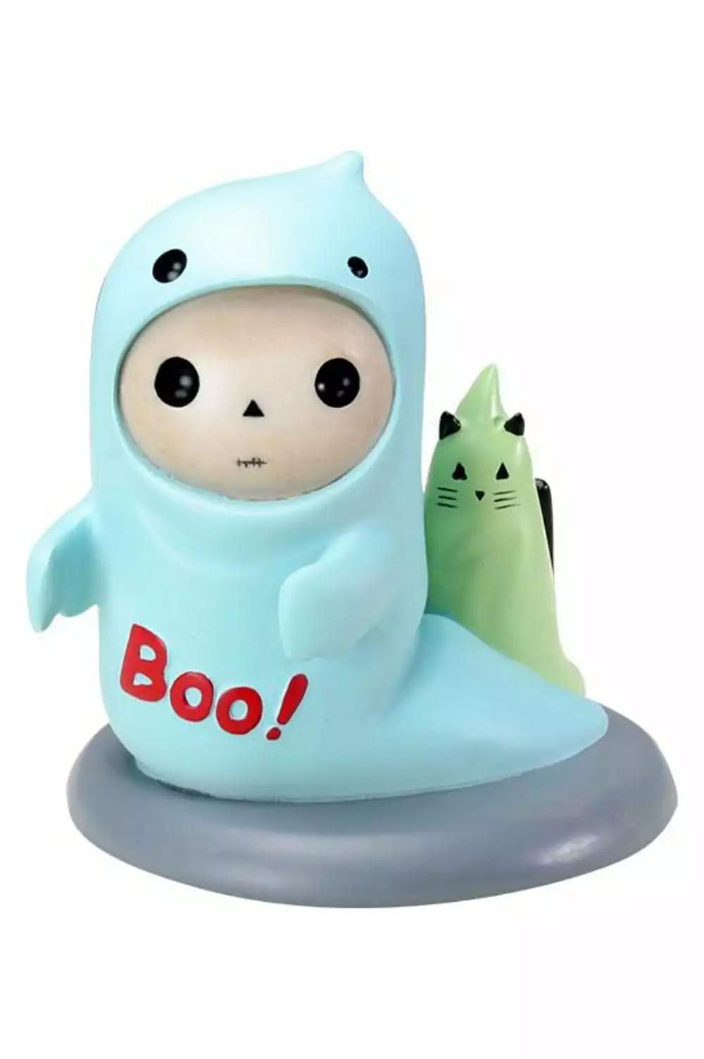 Haunt your home with this spooktacular ghost statue! This creepy cutie features a stitched smile, skeleton face, and baby blue ghost suit. With his green feline friend by his side, this little ghost is dyying to add some spooks to your room!