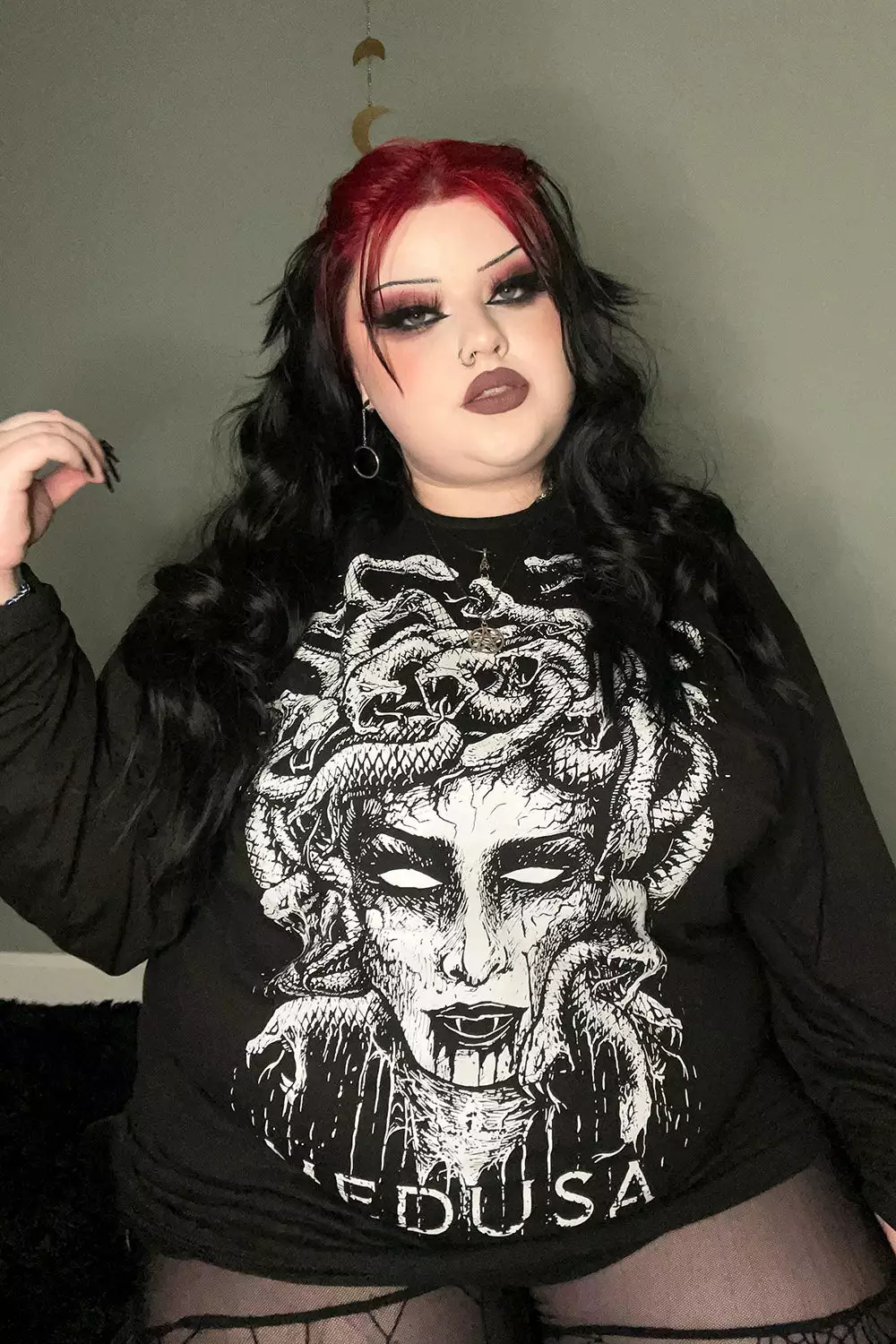 Harness the mystical powers of Medusa in this gothic Greek mythology sweatshirt! Roam the Netherworlds in the heavy metal design, featuring the beheaded face of Medusa with stone-white eyes and venomous fangs. Blood drips from the monstress’ cold lips and neck, as snakes scream and hiss above her decapitated head.