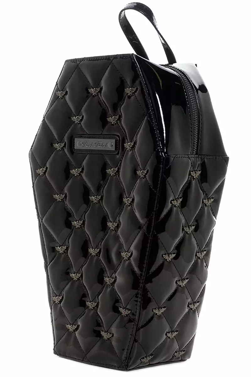 Carry your evil essentials in this drop-dead-darling coffin backpack! Made of quality vegan vinyl, this creepy coffin backpack is haunted all-over with a bewitching quilted pattern and silver bat studs. Keep your possessions safe in the main zippered compartment, inside pocket, and interior spiderweb lining. Complete with adjustable straps for the perfect living dead fit.