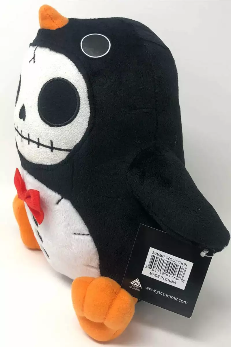 He’s dressed in his best penguin suit with his blood-red bowtie, big black eyes, and stitched smile. Pop him on your bed or rest him on your desk to add some spook to your room!