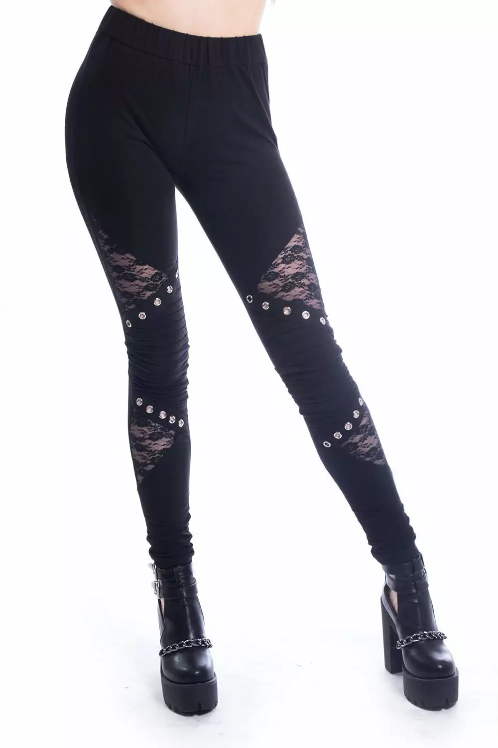 Wake ’em from their darkest dreams in these stunning leggings! Cut-out elements charm the soft black fabric, romanced by floral mesh and silver eyelets. Ribbed details hex the knees to edge out your alt aesthetic. High-waisted and stretchy for a comfy, flattering fit.