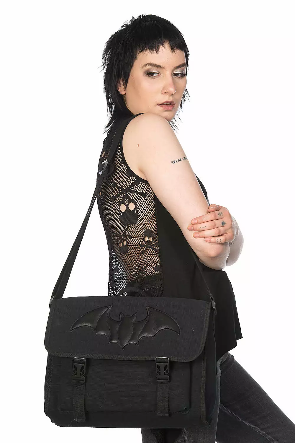 Keep all your smokes and spell books inside this bat-tasic messenger bag, as beautiful and black as the bats that inspired it! The Shadow of the Bat Messenger Bag is constructed of quality cotton canvas, complete with a pleather bat embossment + embroidery. Rock it as a messenger bag or a handbag—you’ve got the power! Sing it over yer shoulder or carry it by the handle. Now whatever will you do with all this power…