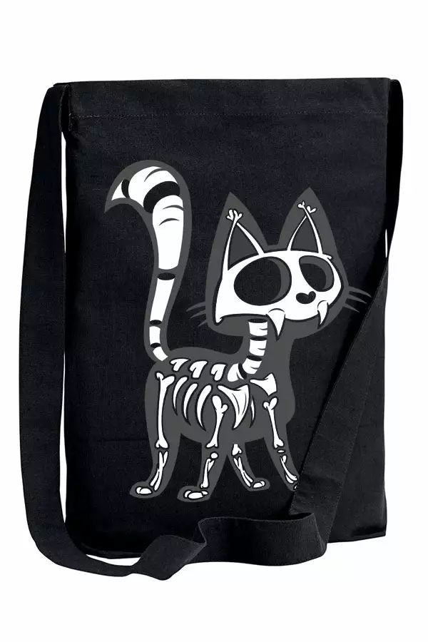 Conjure some cat power with this bundle of bones on your bag! With big empty eyes, fiendish fangs, and bones all about, this creepy cat is dyying to add some spook to yer look. Cart all yer essentials in this goth cat bag when you leave the crypt. No bones about it, yer pawsitively purrfect with the Skelekitty Bag by yer side!