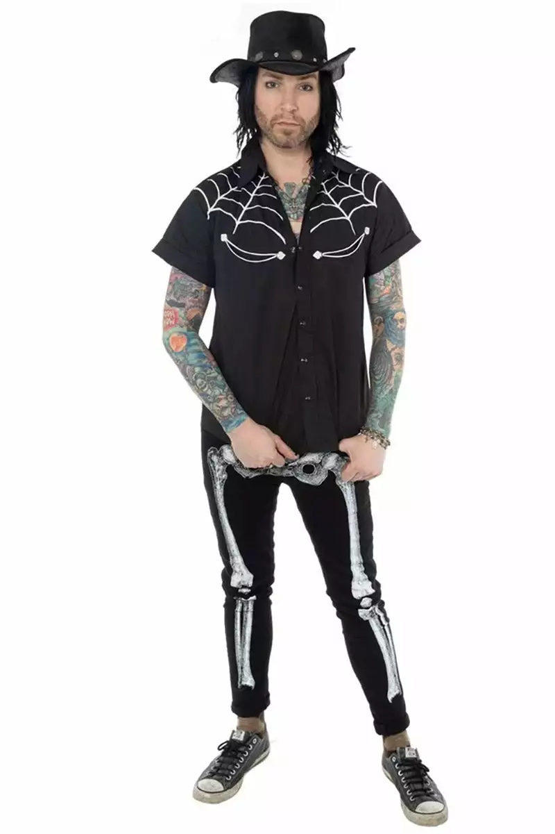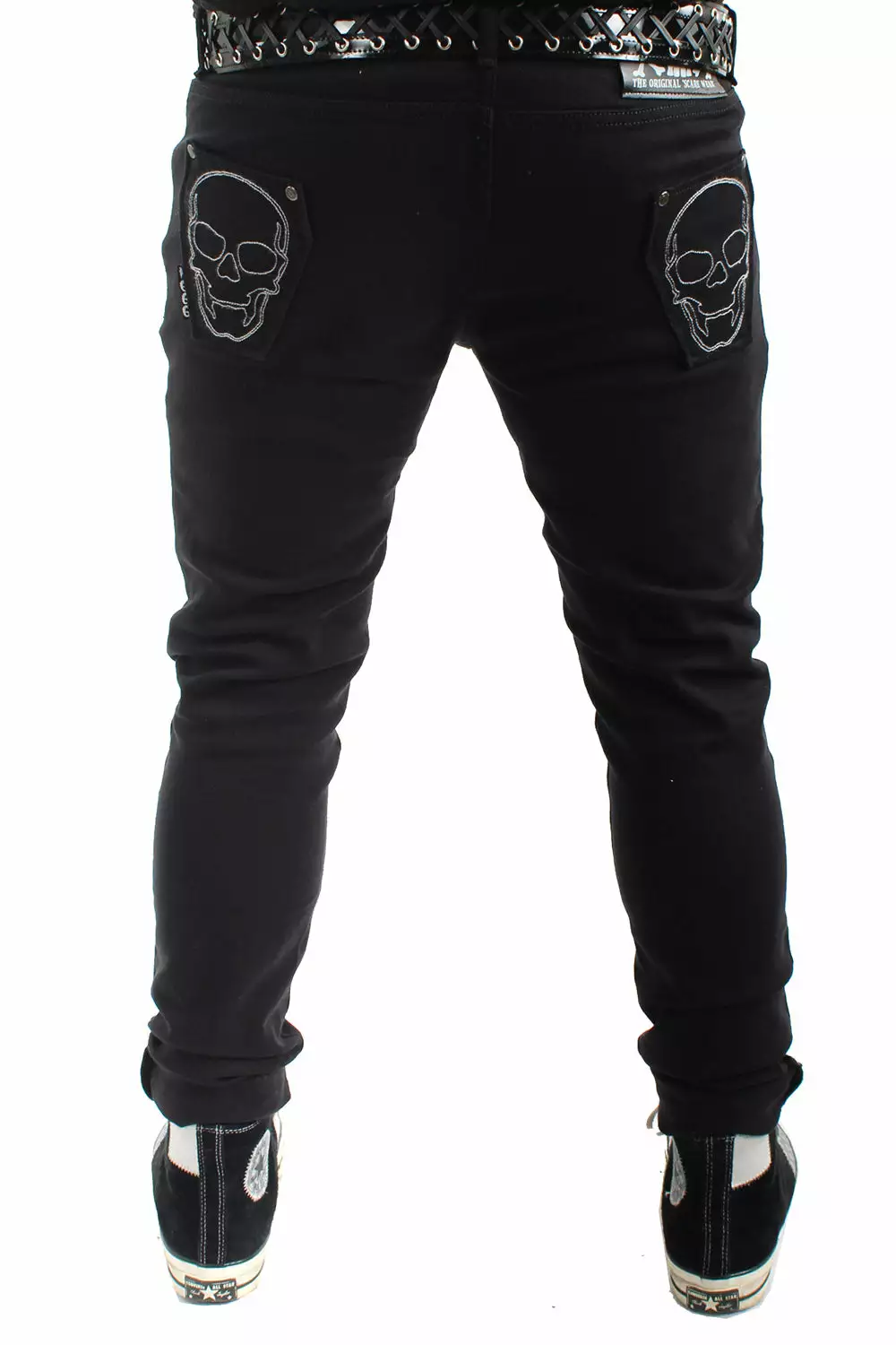 You give ’em femur in these sikk skeleton jeans, black & white and full of fright! Turn every day into Halloween with the distressed skeleton details on the front. Coffin-shaped pockets possess the back, complete with embroidered skulls! They won’t be able to keep their skeleton hands off you…