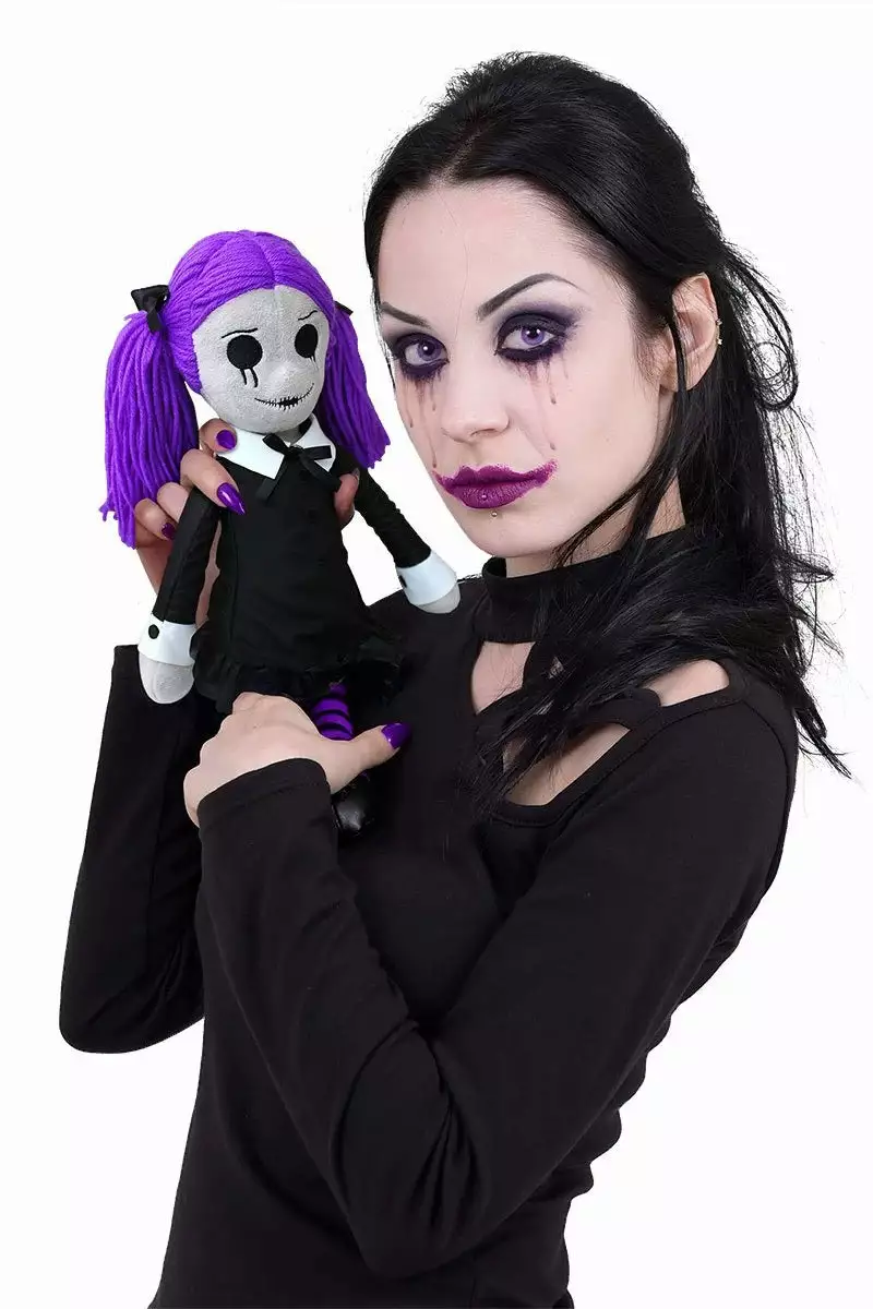 When you were a little ghoul, you weren’t a typical kid. You decapitated dolls like Wednesday Addams, and strung them up with string! Salute your chilling childhood with this creepy cute doll, dyying to be your bedroom buddy! With poison purple hair and empty emo eyes, this goth rag doll is dressed for death in a funeral-black dress and striped tights. Rest Violet on your bed or shelf to add some gloom to the room!