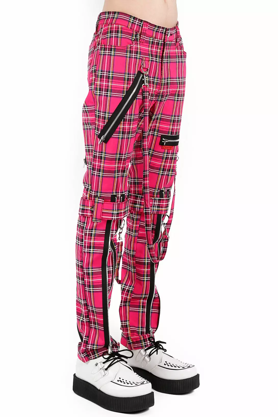 All eyes are on you in these hella hot pink pants, made for the monster on the move. You rock the sh*t outta pink in these punk plaid pants, complete with black contrast strips, zipper details, and buckles on the knees. Zip up the pant legs for a change in fit—remove the bondage straps for a lax look. Made of high-quality cotton, these straight leg pants are constructed to keep you comfy & cool all the dangerous dayz of yer life.
