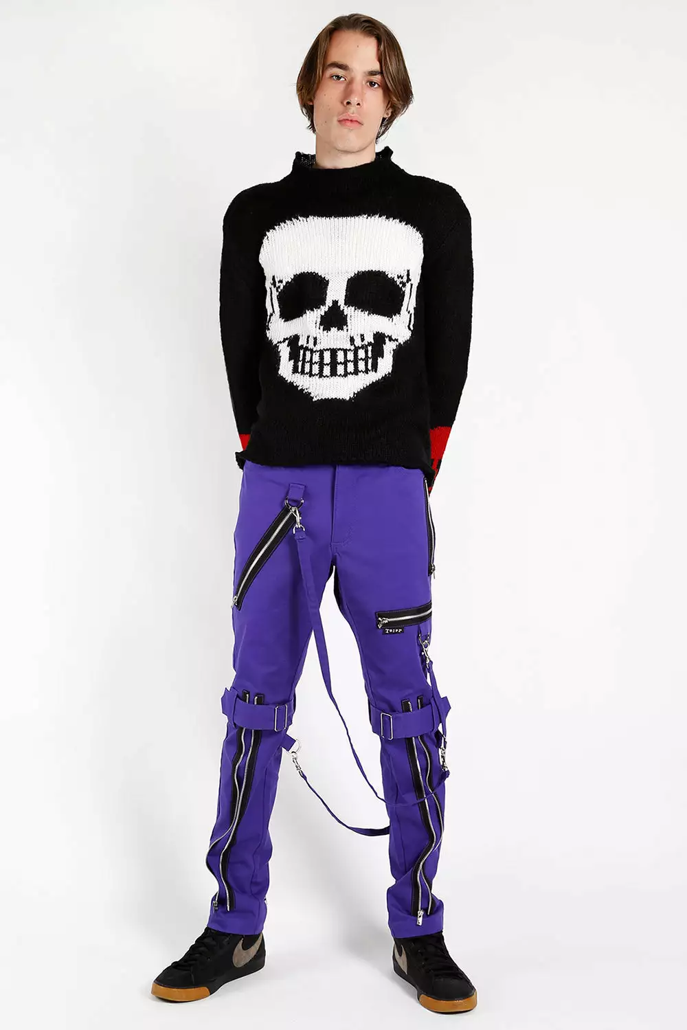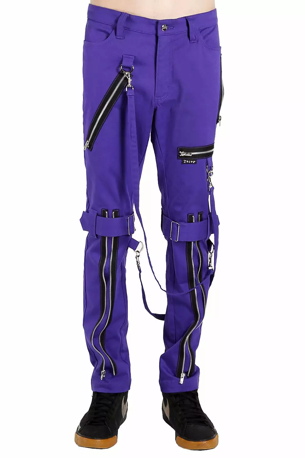 Be the one they won’t forget in these one-of-a-kind Tripp pants. Constructed of bright purple fabric, these punk pants bring the extreme with the contrast strips, D-ring hardware, and zipper details. Zip up the pant legs for a change in fit—remove the bondage straps for a lax look.