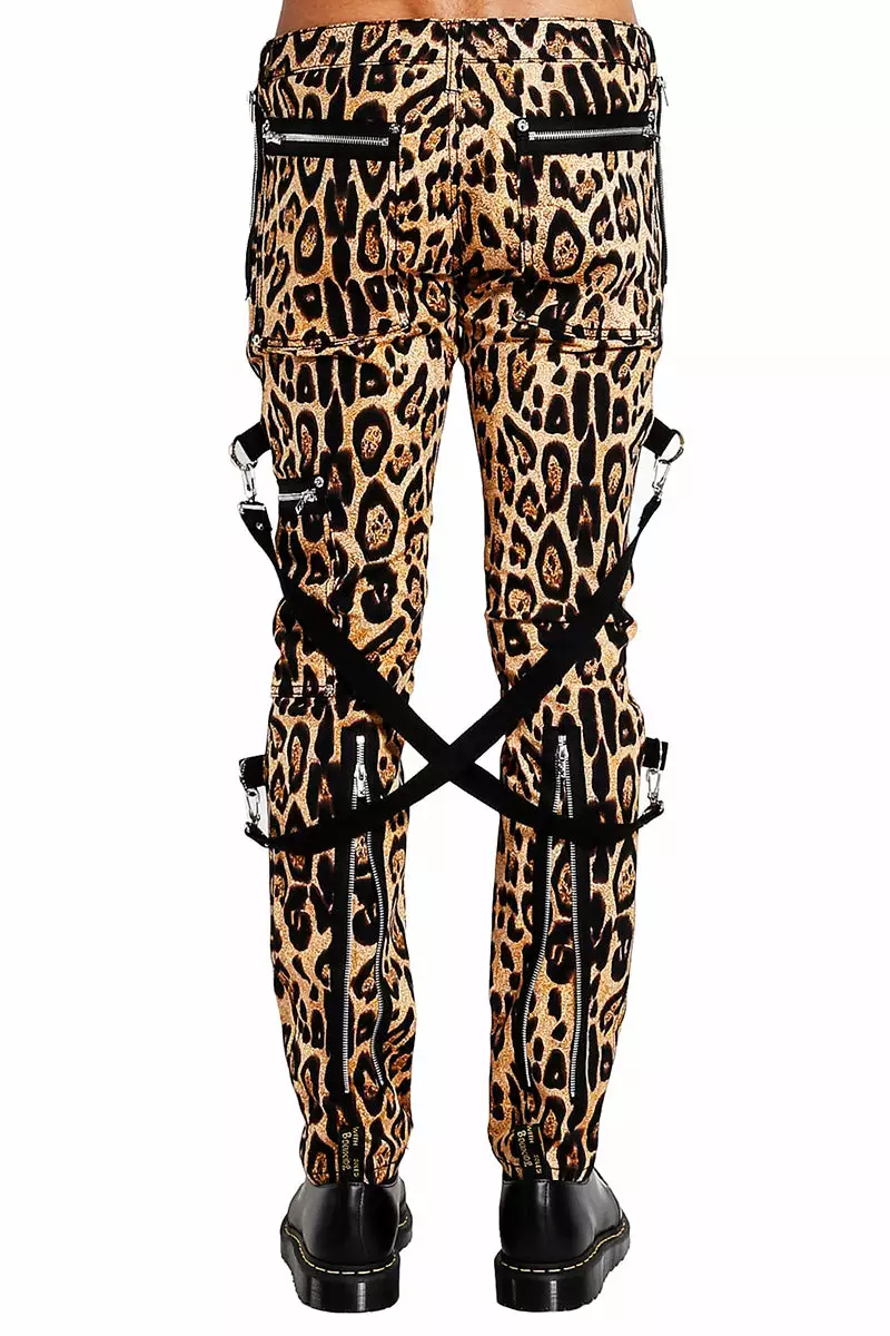 Unleash in these killer Tripp pants, possessed with a wild animal print. Embrace the chaos within in the all-over leopard detailing, zipper hardware, and detachable bondage straps. Finished with pockets and silver zippers on the pant legs—adjustable for a change in fit!