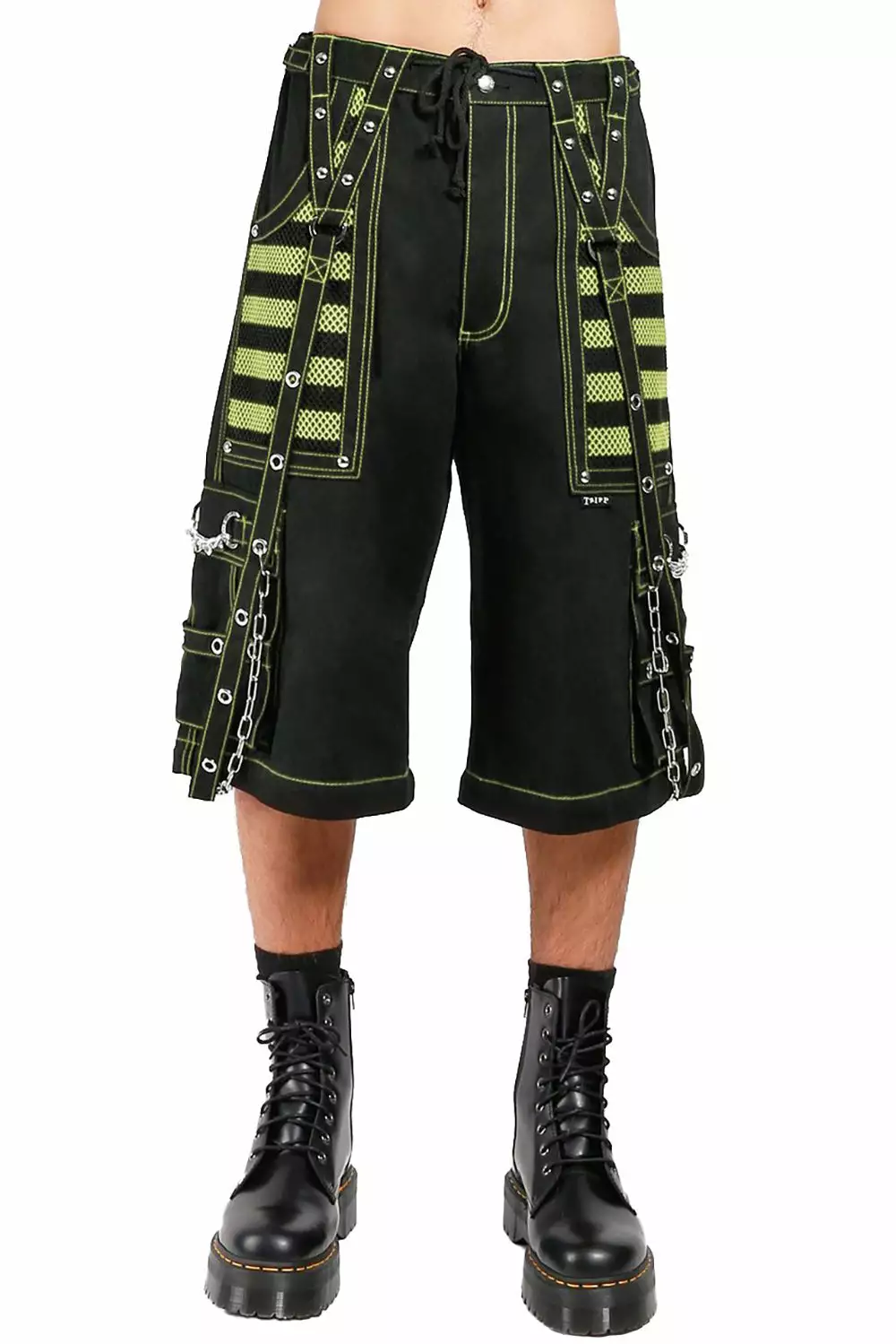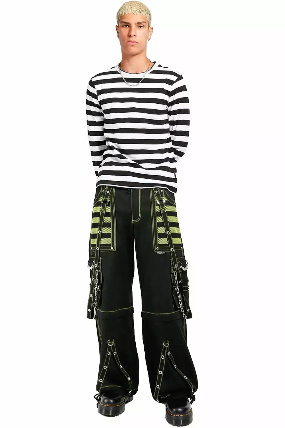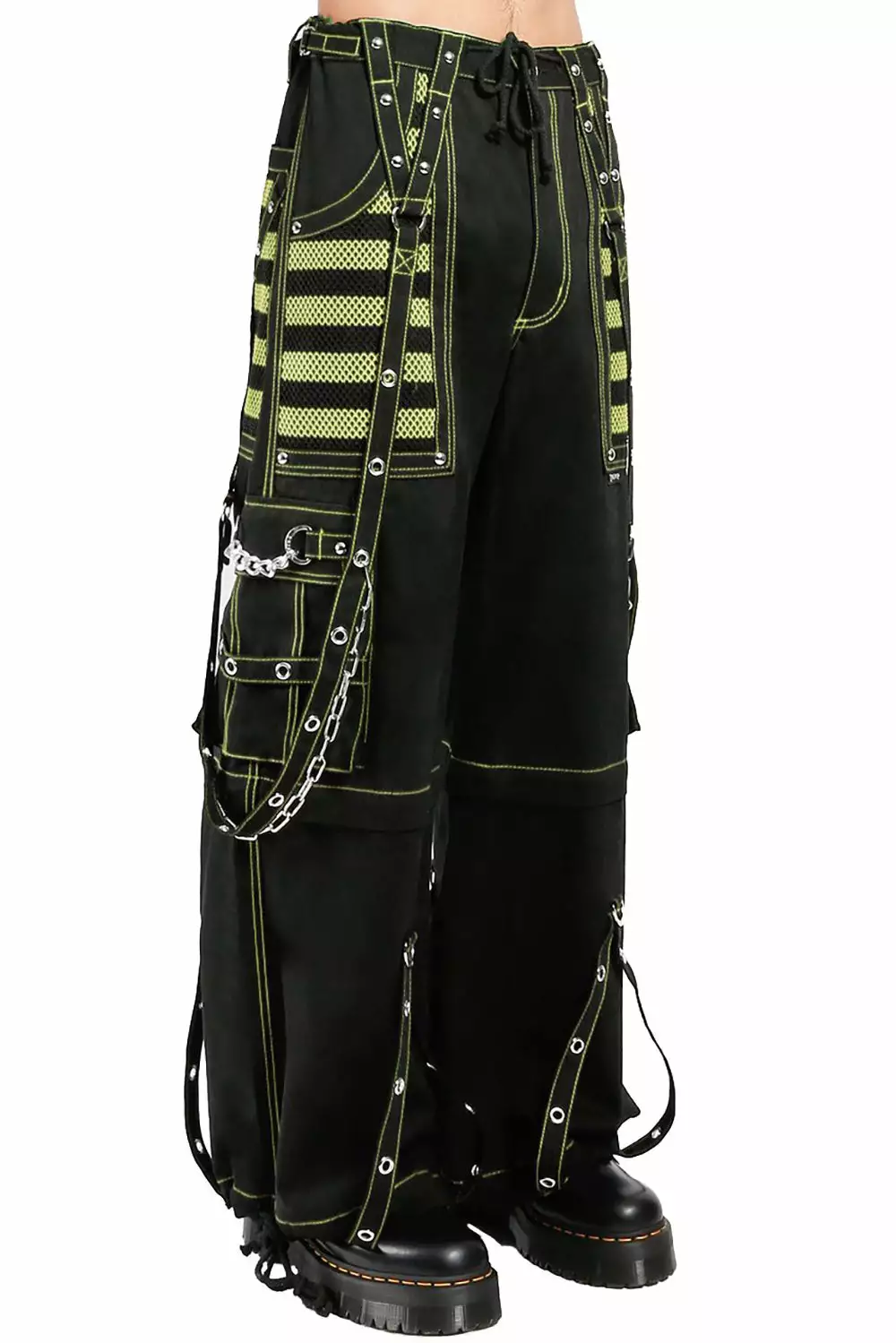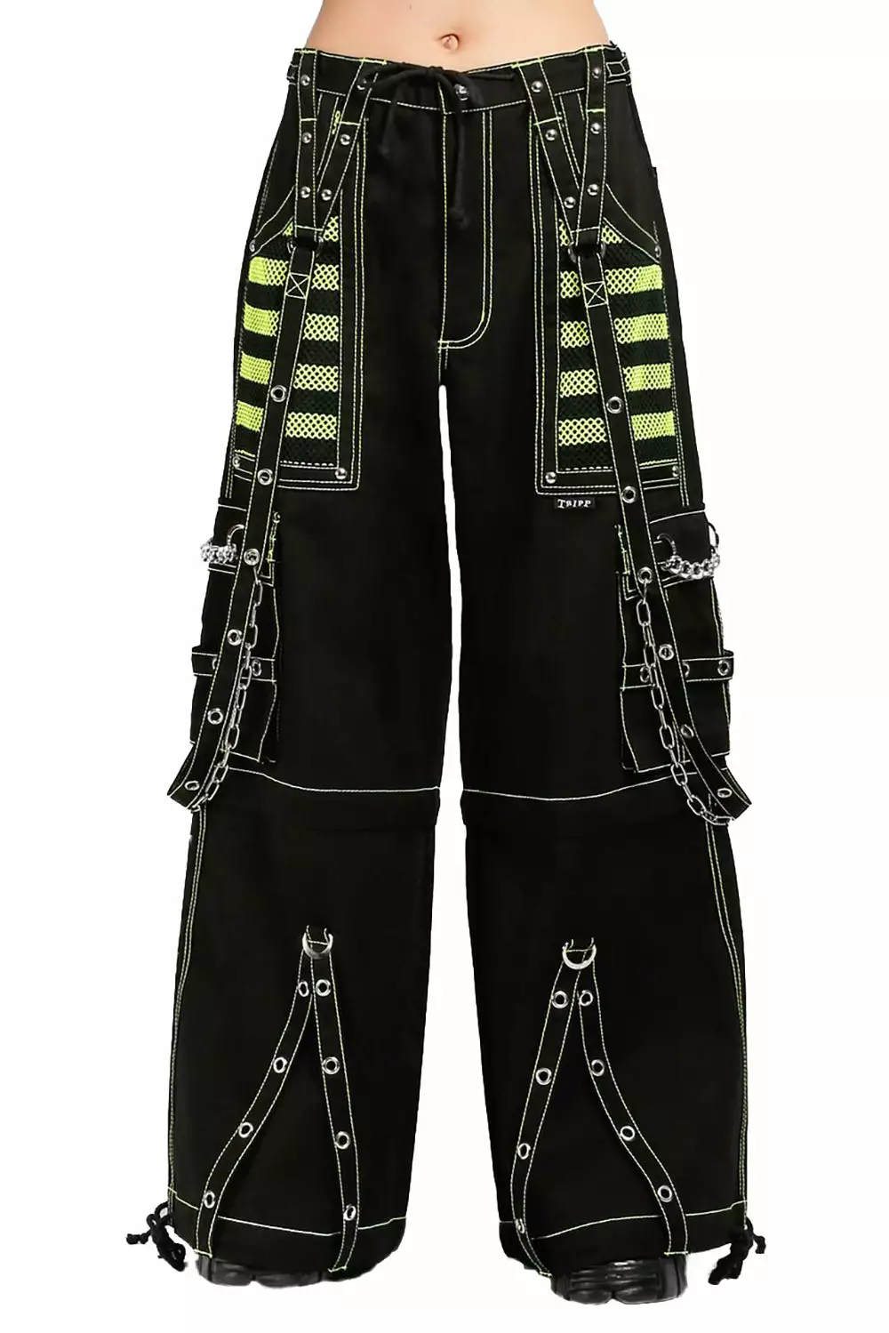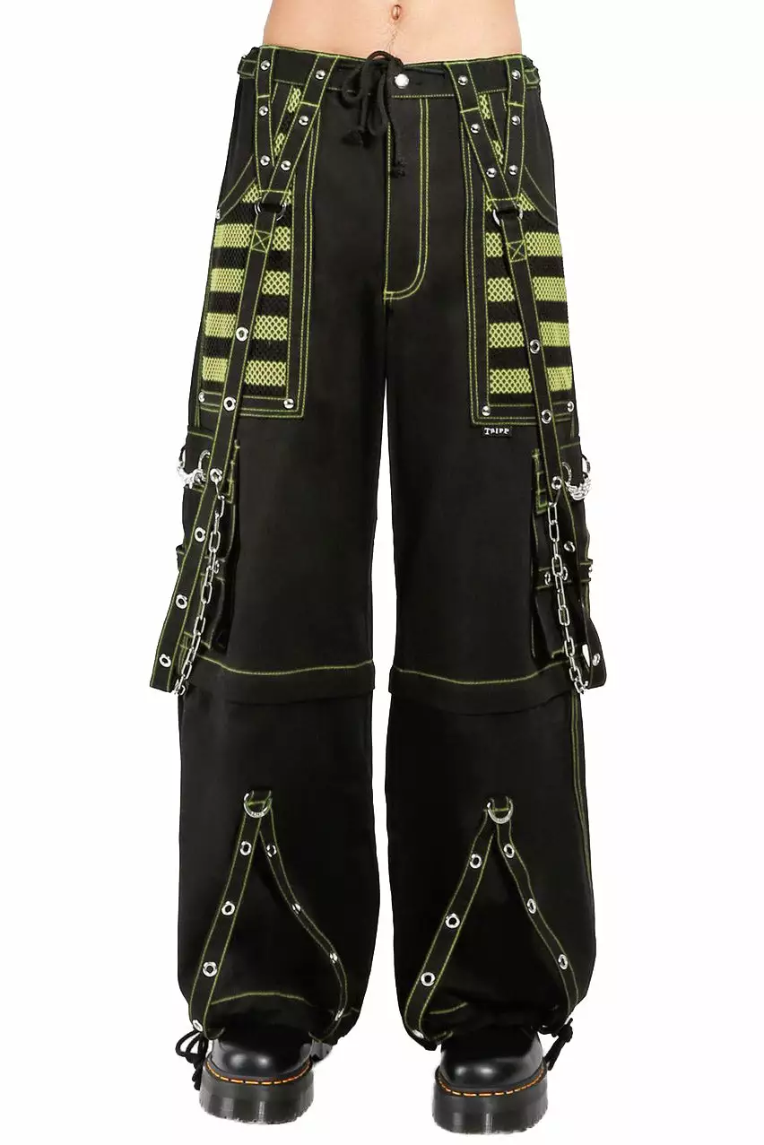 Electrify the night in these baggy black pants, hexed with metal eyelets, silver chains, and detachable bondage straps. Neon yellow stripes and stitching accents possess these statement mall goth pants. Use the drawstring waist and adjustable ankles for a change in fit—zip off the pant legs to transform these Tripp pants into shorts! Finished with deep netted pockets for carrying your punk essentials.
