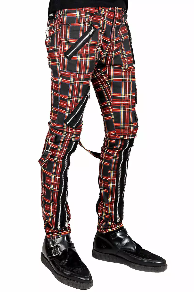 These red plaid pants are bad to the bone! Haunt the streets in these punk pants complete with contrast strips, zipper details, and D-ring hardware. Zip up the pant legs for a change in fit—remove the bondage straps for a lax look. Made of high-quality cotton, these slim pants are constructed to keep you comfy & cool all the dangerous dayz of yer life.