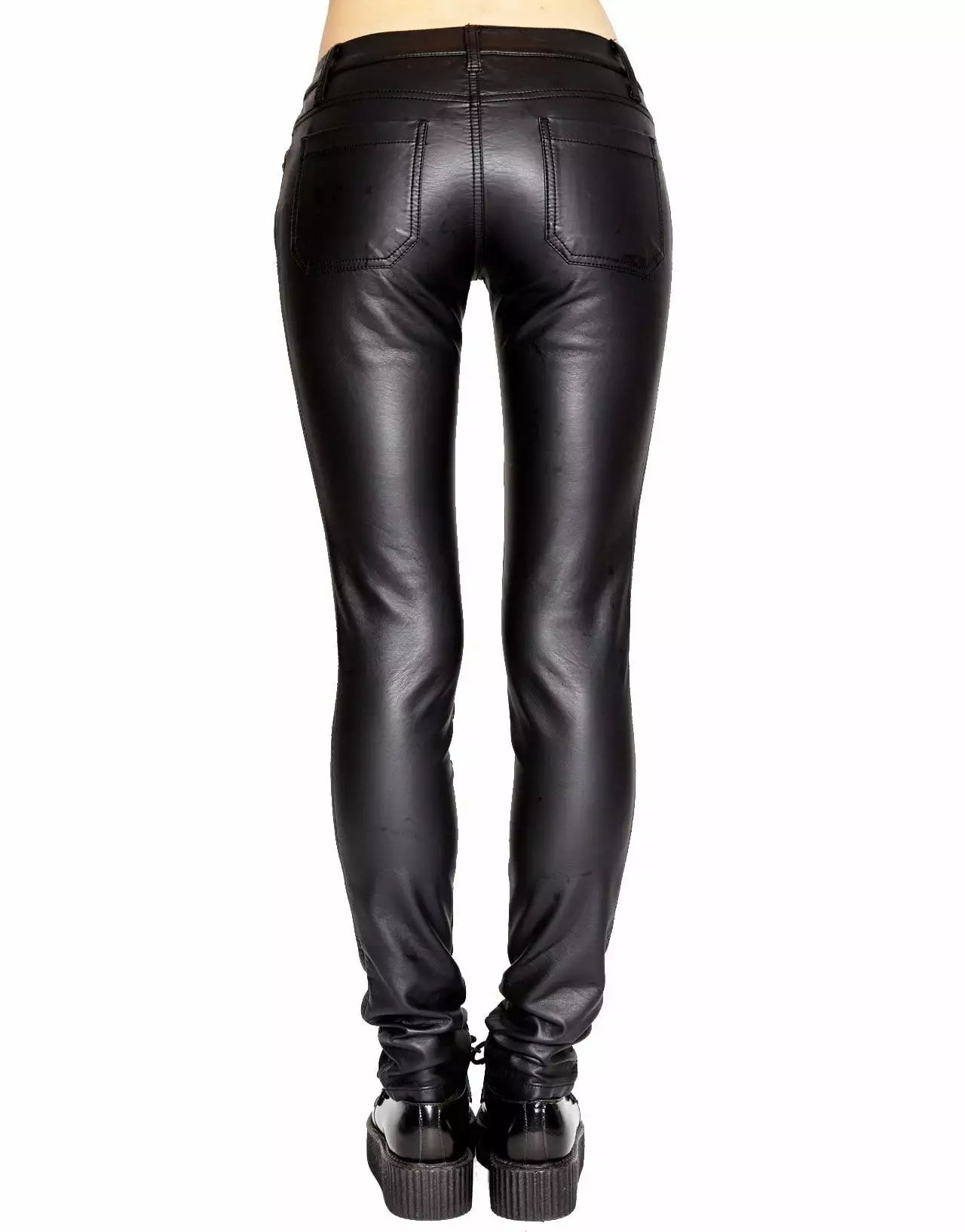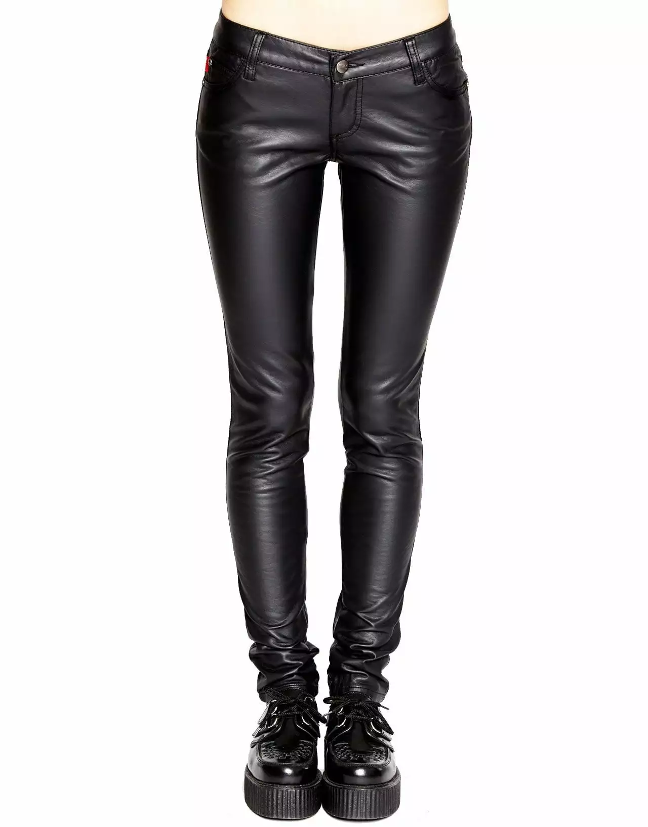 You’re too legit to quit in these vinyl skinny jeans, designed to unleash your inner devil. You’re stage-ready in the black-on-black thread details, 5 pockets, and premium pleather fabric. In these sexy skinnies, the world is yours.