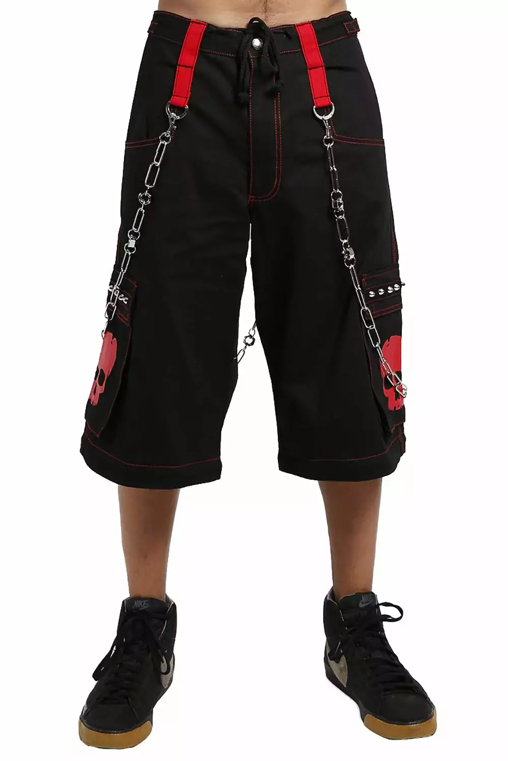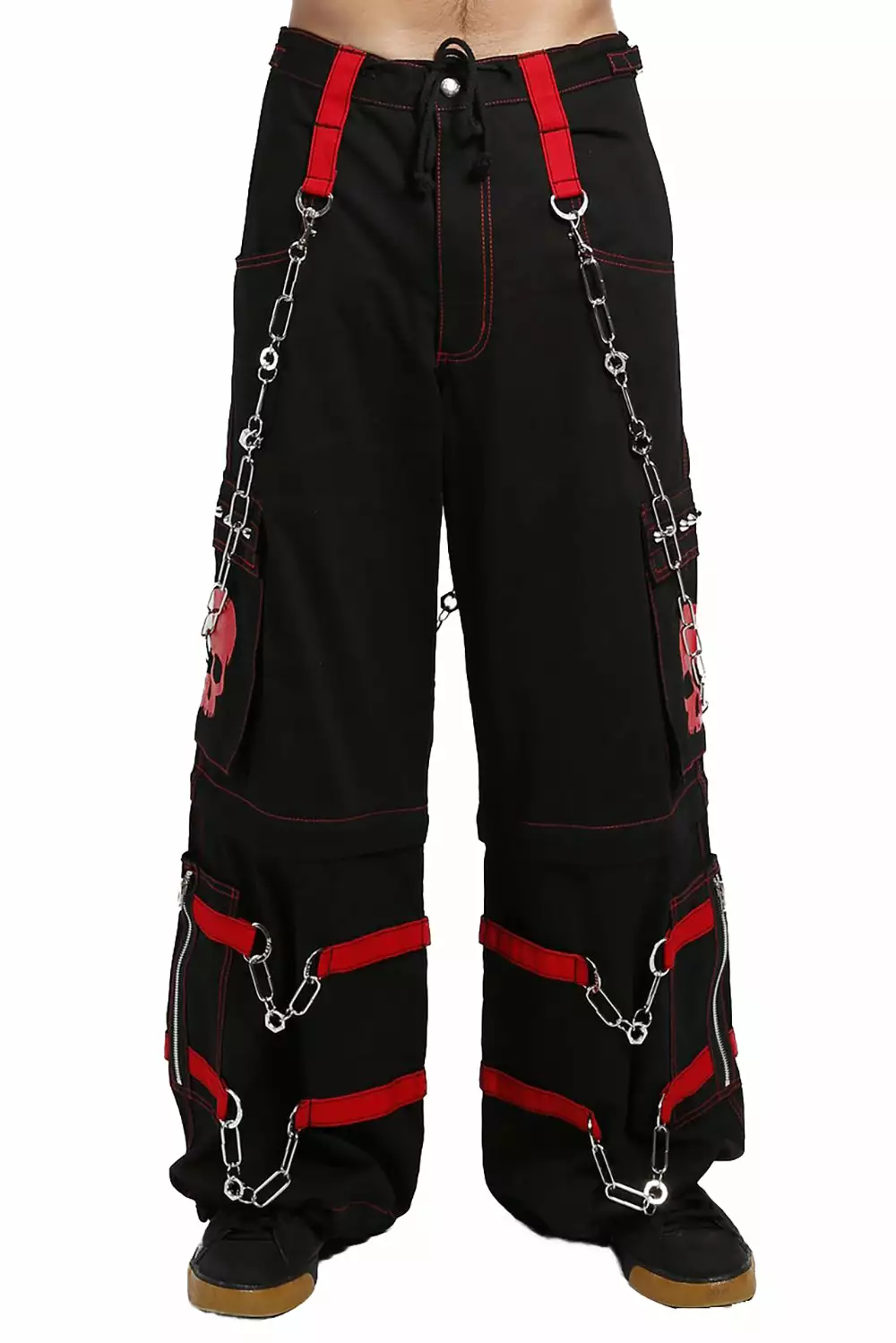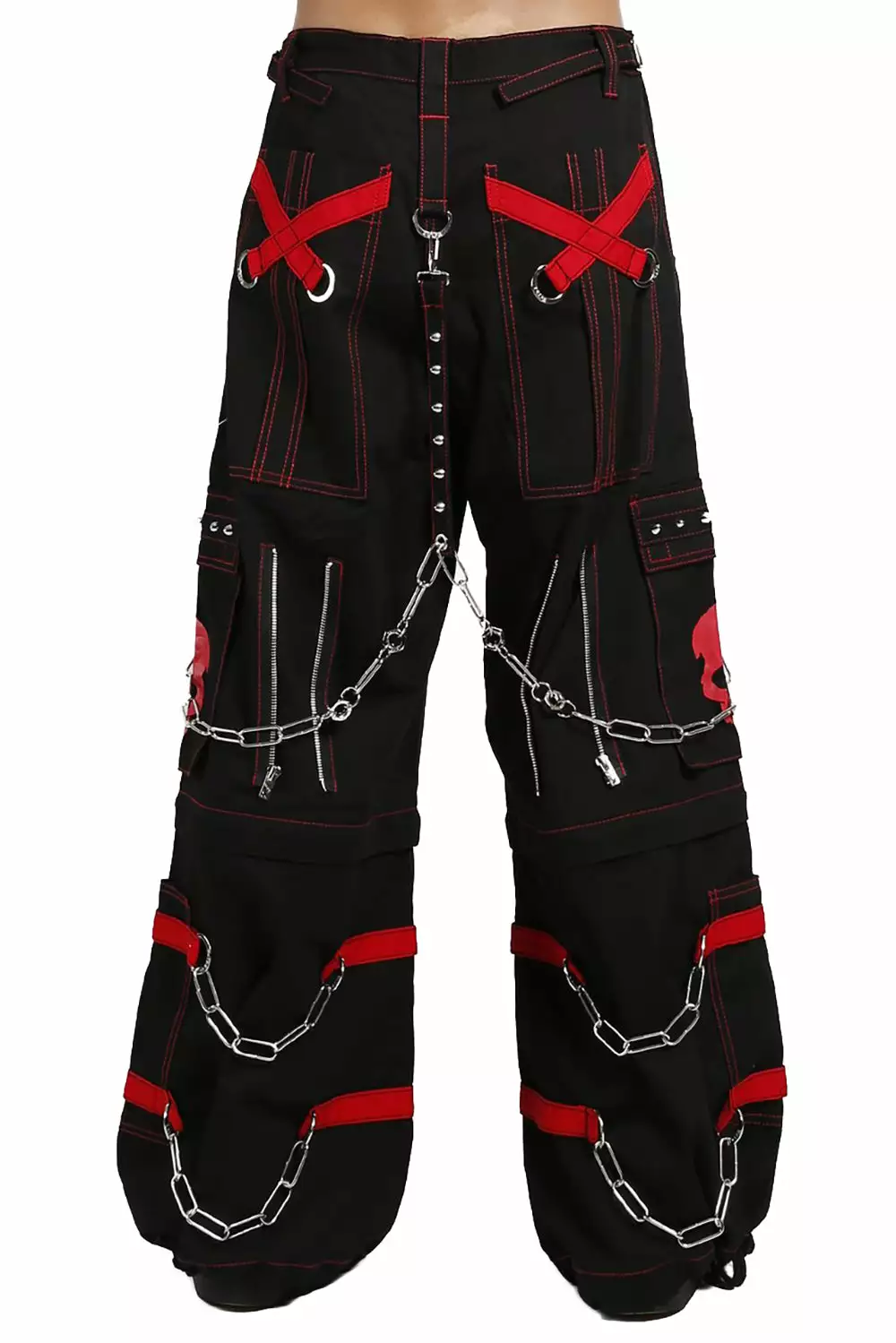 Defy death in these baggy bondage pants! Red accent strips and sinister skulls haunt the black cotton construct—silver chain hardware and metal zippers possess the front + back. Live your afterlife in comfy style in the drawstring waist and adjustable zippered legs. Zip off the pant legs to transform these Tripp pants into shorts!