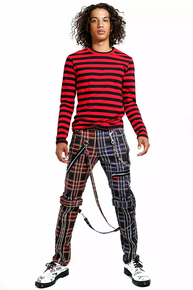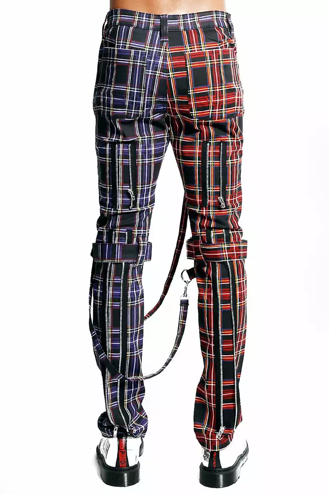 Purple and red, these plaid pants are bad to the bone! You’re Harley Quinn’s Puddin in these punk pants complete with contrast strips, zipper details, and D-ring hardware. Zip up the pant legs for a change in fit—remove the bondage straps for a lax look. Made of high-quality cotton, these slim pants are constructed to keep you comfy & cool all the dangerous dayz of yer life.
