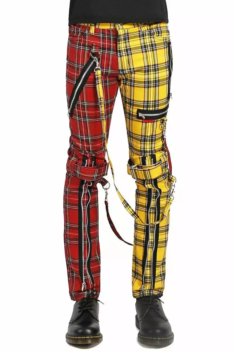 Evoke some Joker feelz in these two-tone Tripp pants! Red and yellow, these plaid pants are bad to the bone. You’re Harley Quinn’s Puddin in these punk pants complete with contrast strips, zipper details, and D-ring hardware. Zip up the pant legs for a change in fit—remove the bondage straps for a lax look. Made of high-quality cotton, these slim pants are constructed to keep you comfy & cool all the dangerous dayz of yer life.