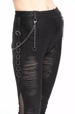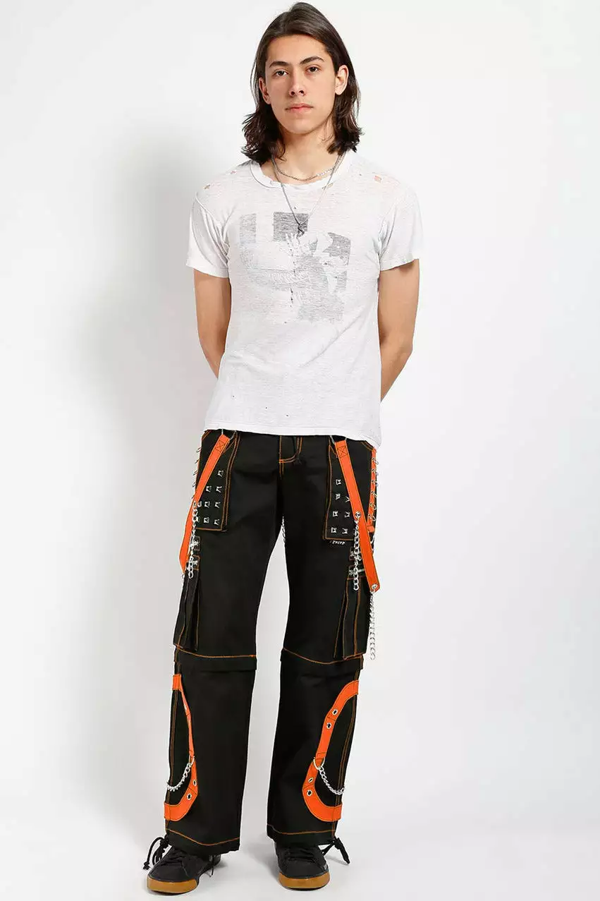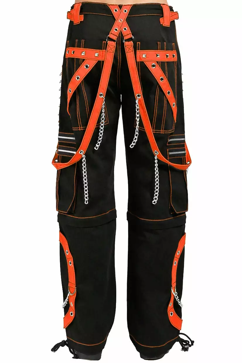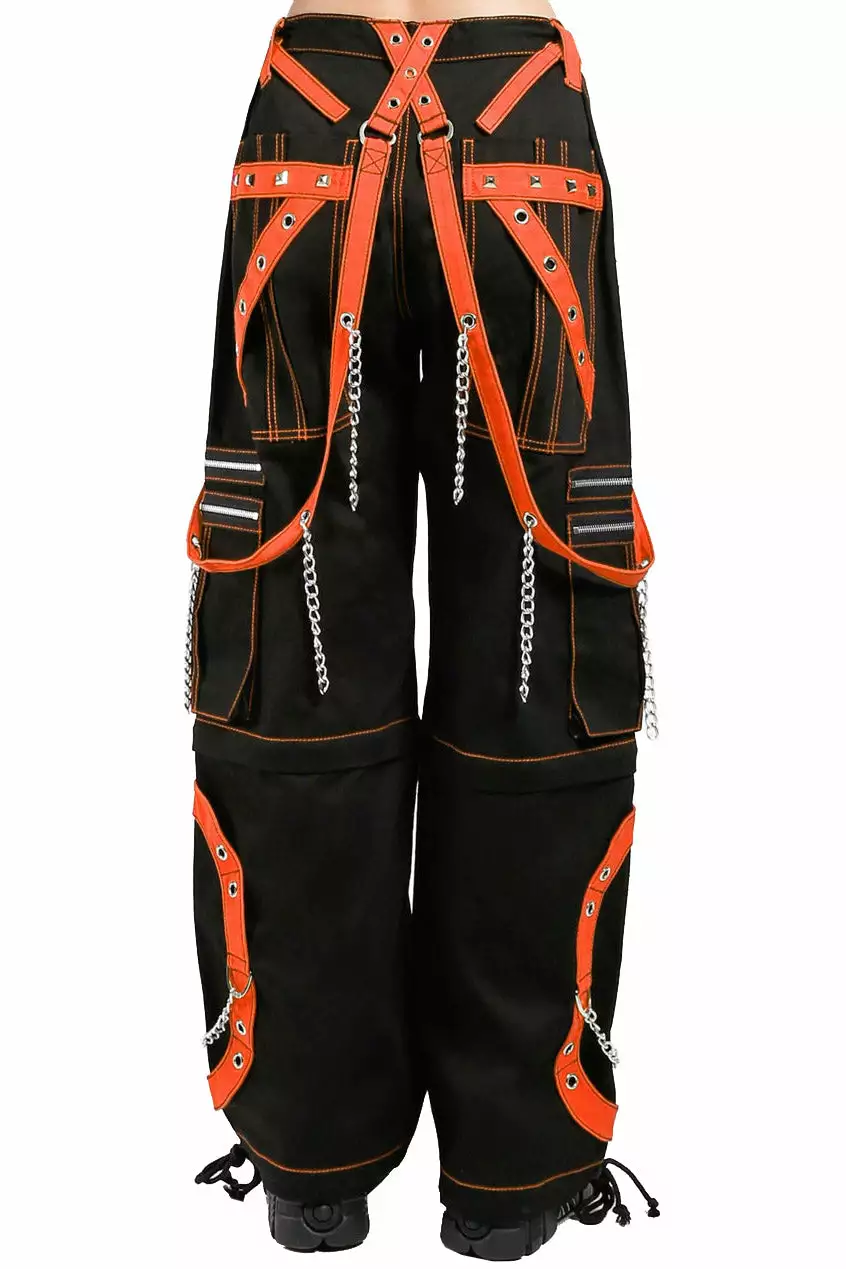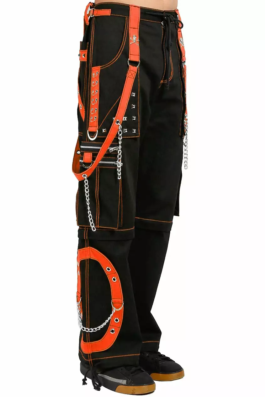 Haunt the night in these baggy bondage Tripp pants! Carry your evil essentials in the deep pockets, hexed with metal pyramid studs. Electrify the gloom in the epic orange accents, skull & crossbone elements, silver eyelets, and metal piercing hardware. Adjust the ankles and drawstring waist for the perfect punk fit. Finished with detachable bottoms so you can transform these Tripp pants into shorts whenever your dark heart desires.