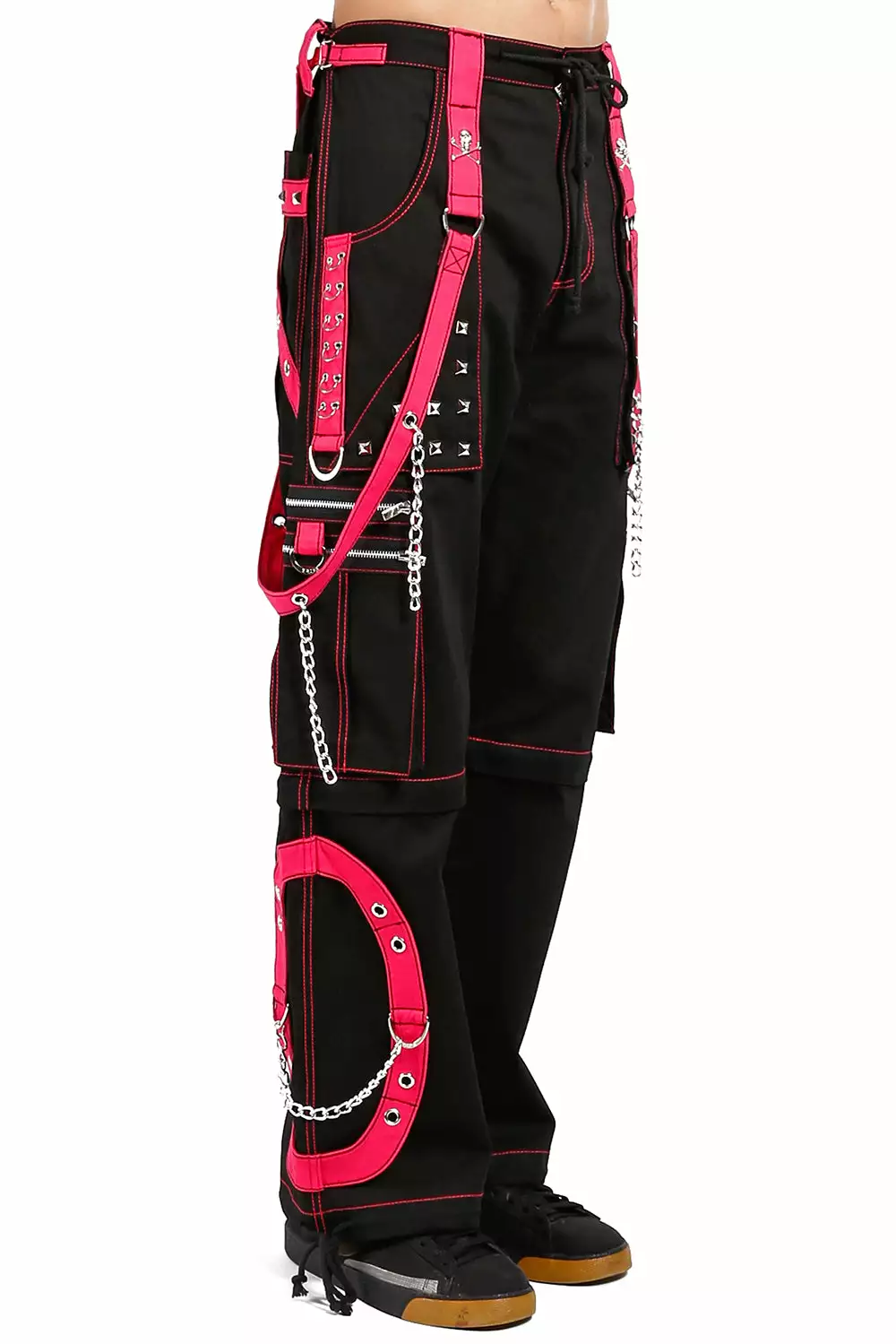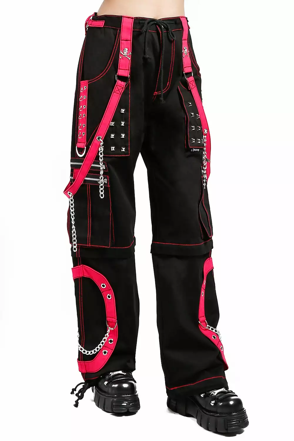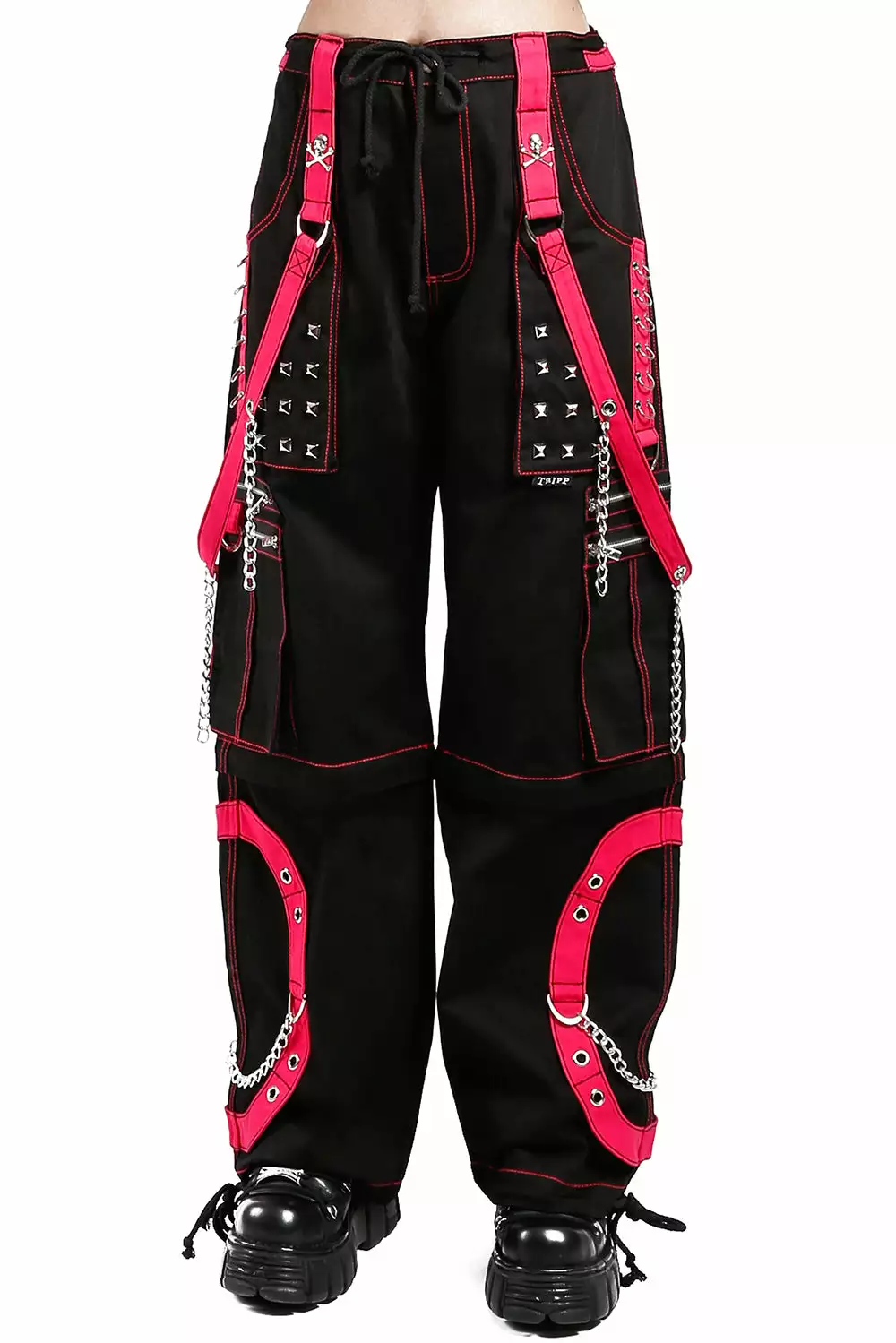 Raise hell in these stud-struck Tripp pants! Haunt the night in the baggy construct, hot n’ loaded with pink accent straps, metal pyramid studs, D-ring piercings, and silver chain hardware. Punk-up your aesthetic with the badass bondage straps, possessed with statement skull & crossbones details. Zip off the pant legs to transform these Tripp pants into shorts. Complete with adjustable ankles for the sinfully perfect fit!