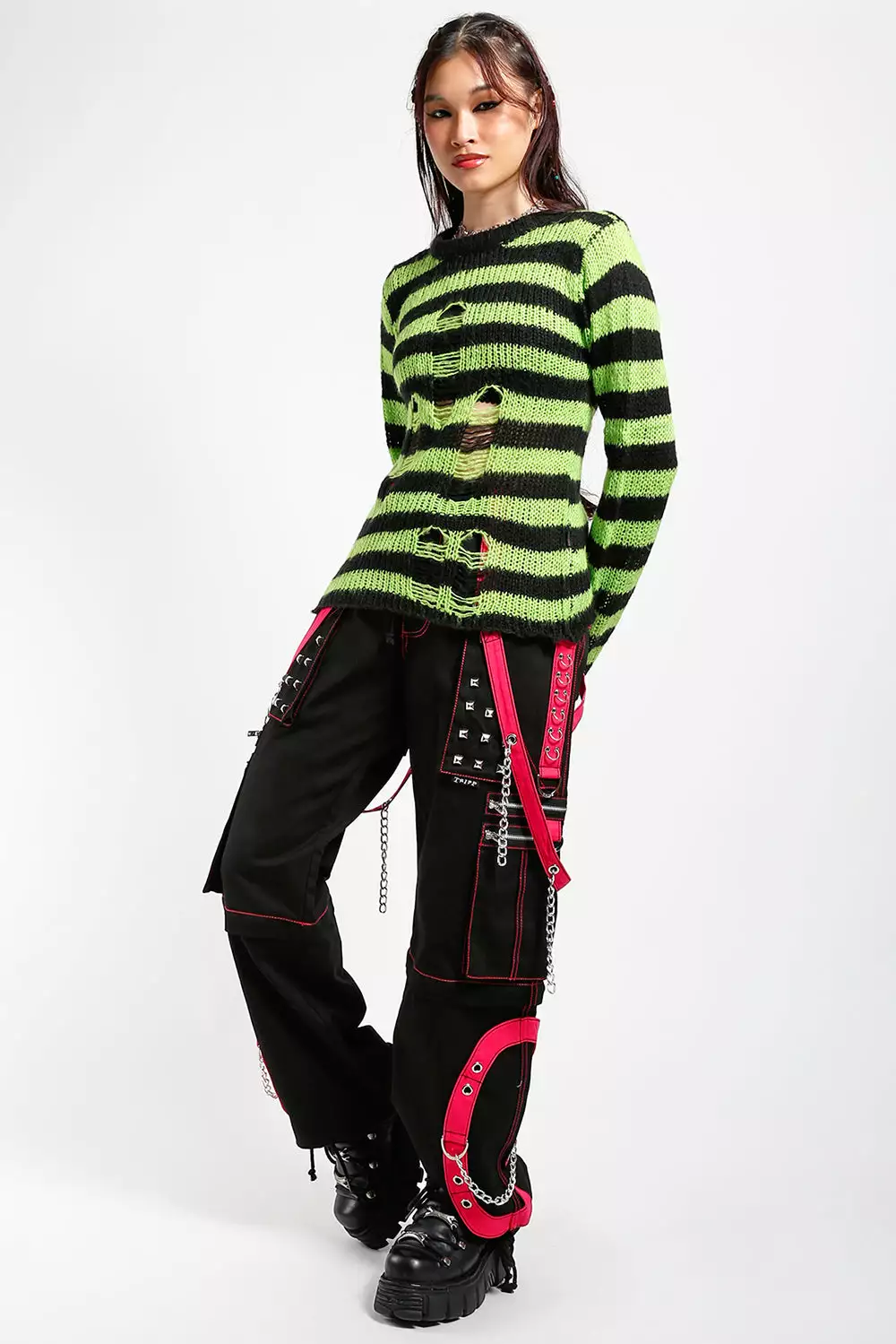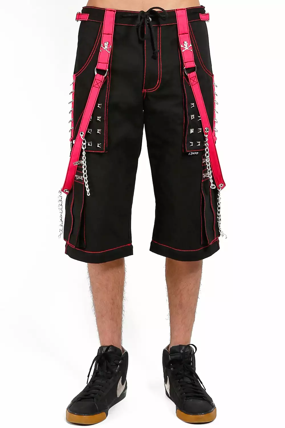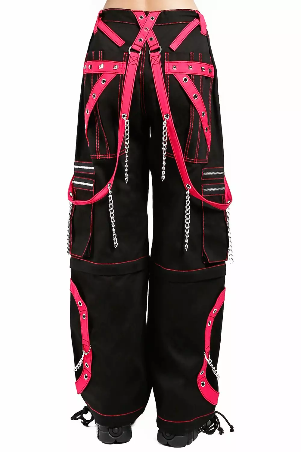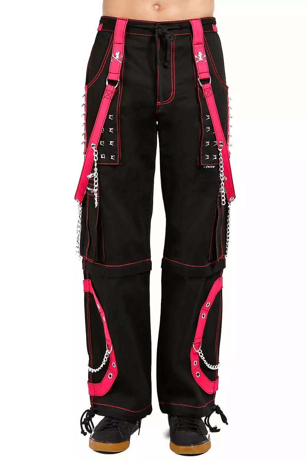 Raise hell in these stud-struck Tripp pants! Haunt the night in the baggy construct, hot n’ loaded with pink accent straps, metal pyramid studs, D-ring piercings, and silver chain hardware. Punk-up your aesthetic with the badass bondage straps, possessed with statement skull & crossbones details. Zip off the pant legs to transform these Tripp pants into shorts. Complete with adjustable ankles for the sinfully perfect fit!