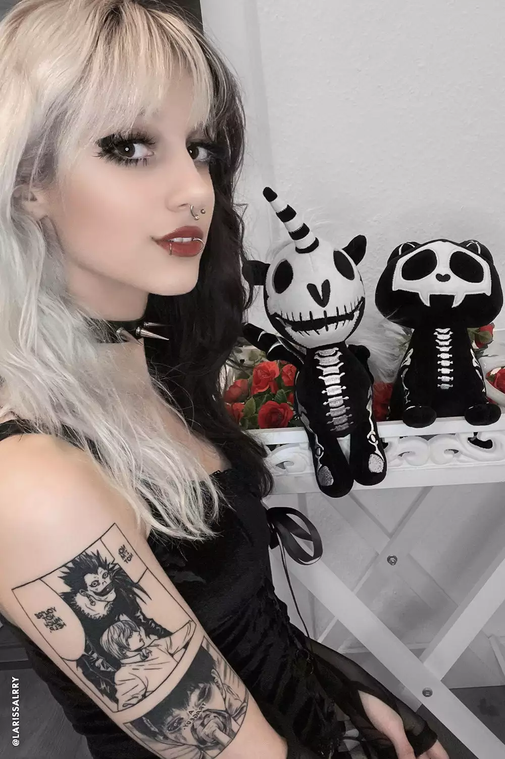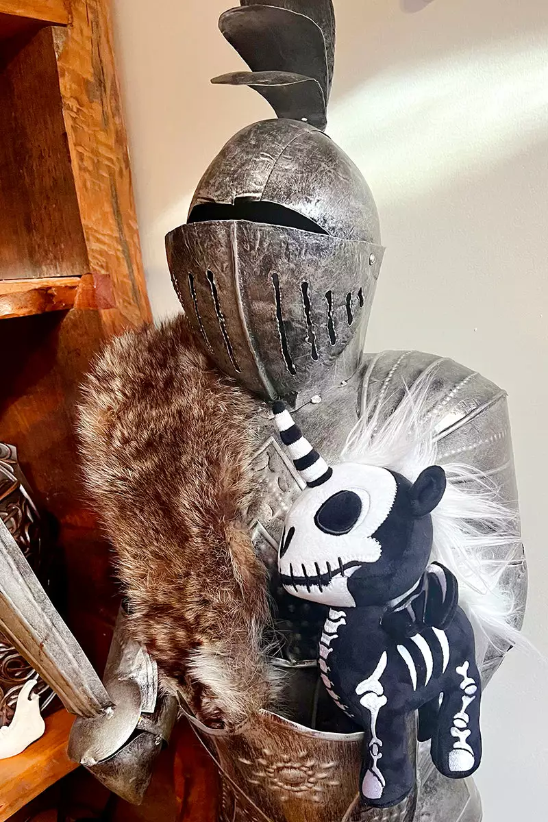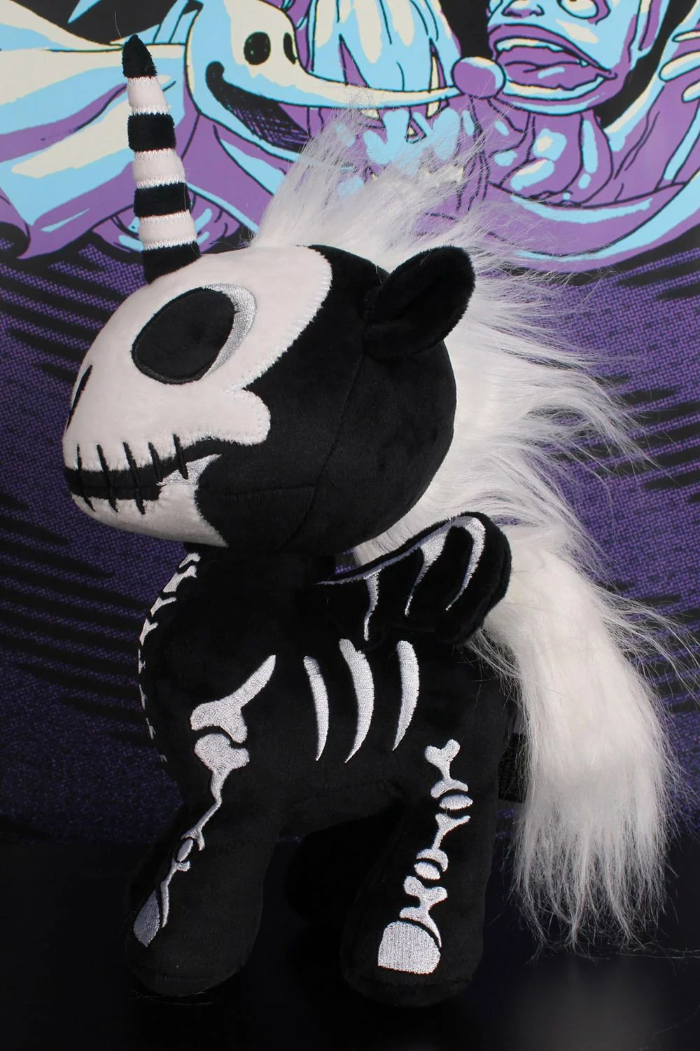 Make any room magical as an emo rainbow with this skeleton unicorn! Made of soft huggable plush, this creepy cutie features a dead unicorn complete with bat wings, bony body, fiendish fangs, striped horn, and ghostly-white mane. Play with her posable wings—stand her up on her haunted hooves! Adopt Unibones and she will love you with her whole, unbeating unicorn heart.